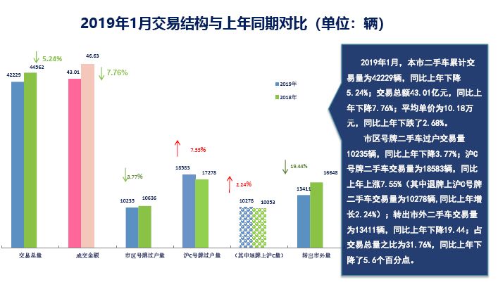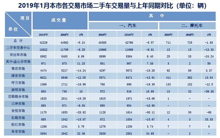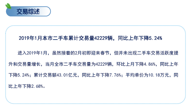 上海二手车协会:2019年1月上海二手车交易分析 2019年1月上海二手车累计交易量为42229辆,同比上年下降5.24%,环比上月下降4.86%;累计交易额43.01亿元,具体数据如下: 更多阅读:上海二手车协会:2019年1-6月上海二手车交易分析上海二手车协会:2019年1-9月上海市二手车交易分析上海二手车协会:2020年1-2月上海二手车市场分析上海二手车协会:2020年1-3月上海二手车交易数据上海二手车协会:2019年1-7月上海市二手车交易分析上海二手车协会:2019年1-2月份上海二手车简报上海二手车协会:2019年1-3月上海市二手车累计交易量109581辆,同比上年微增0.3%2019上海车展百度风向标上海二手车协会:2019年1-12月上海市二手车交易分析上海二手车协会: 2020年1-5月上海二手车市场分析上海二手车协会:2020年1-6月上海市二手车交易市场中国新兴城市50强蓝汛通信:2012年Q4上海平均网速约为4.04Mb/s 高居全国榜首上海住宅空置率研究CBRE:2018年上海房地产市场回顾与展望