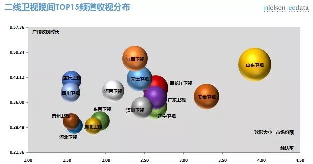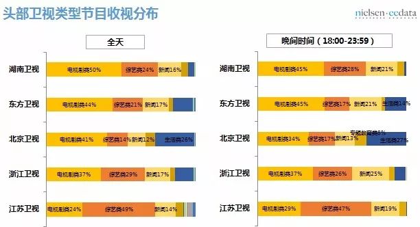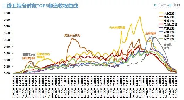 尼尔森网联海量融源收视率(全国网)的数据显示,二线卫视频道优势时段并不集中,各个频道在各个时段均有支撑起收视高潮的代表性节目,且节目类型分布较为不同,类型多样。