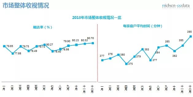 尼尔森网联海量融源收视率(全国网)数据显示,2018年电视收视在全国市场整体表现高位运行,保持高触达和高收视时长。特别是进入四季度之后,趋势向好。在经济形势趋稳的大环境下,回家看电视成为一个不错的休闲娱乐和获取信息的选择。
