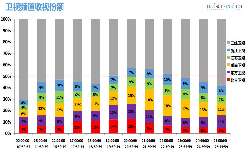 卫视组内部频道间差距较大,头部卫视下午时段份额占比略高于上午时段,晚间19:00-23:00头部五大卫视在整体卫视频道组份额中占比可达50%及以上,其中尤以湖南卫视占比最高,在21:00-23:00份额达到最高,占比达18%。