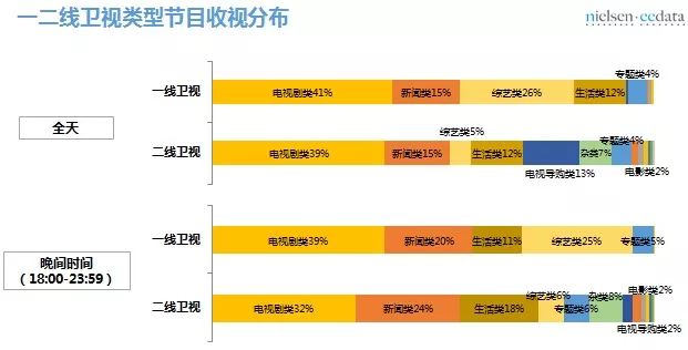 不同于一线卫视主要贡献收视的节目类型较为集中,二线卫视能对收视产生贡献的节目类型更丰富,在两级卫视均有较大贡献比例的节目类型为电视剧类、新闻类及生活类,综艺类节目对二线卫视收视贡献相对偏低。二线卫视全天时段电视导购类节目在编排上仍有一定占比,晚间生活类节目对收视贡献较一线卫视略高。