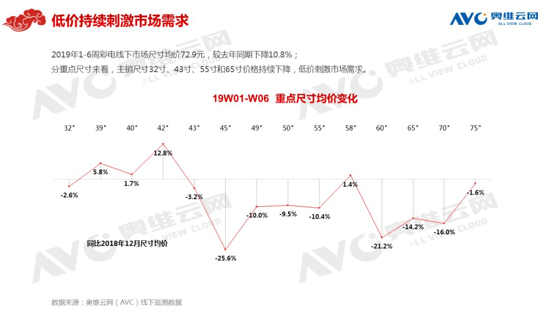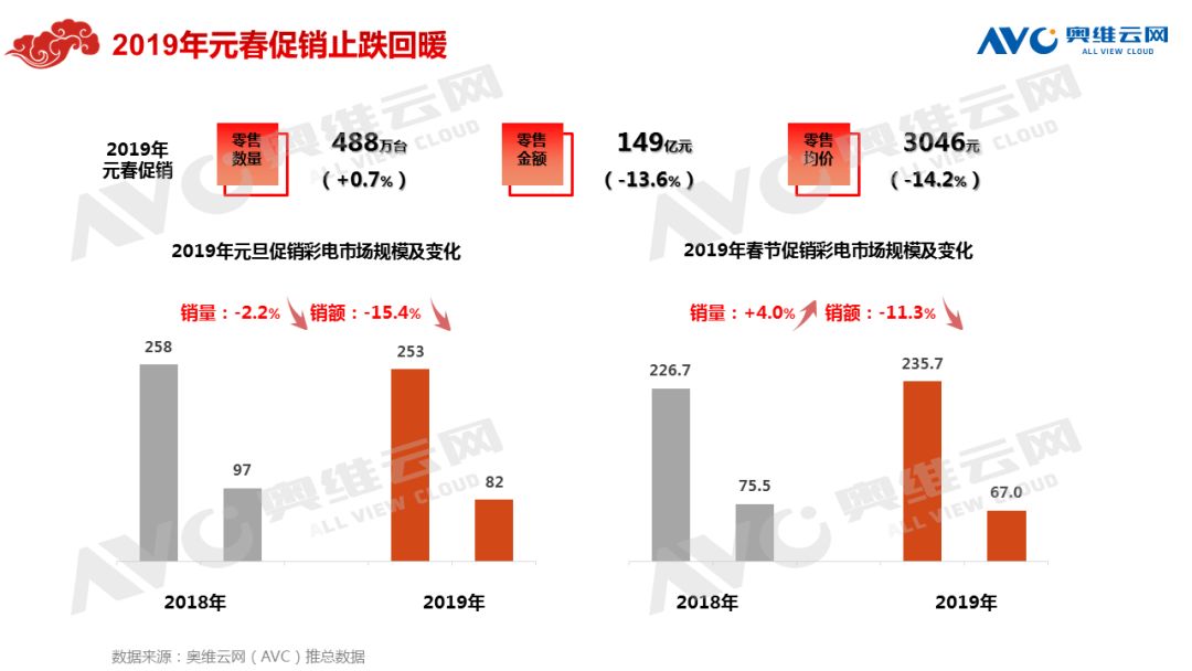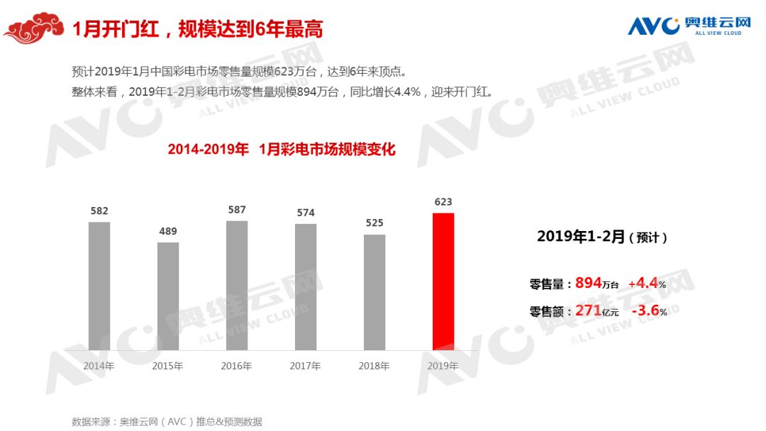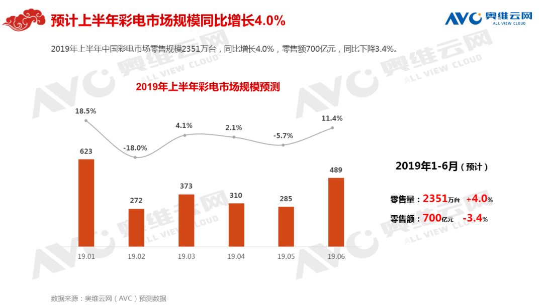 2019年政府推出相关政策鼓励家电消费,对电视市场而言,绿色、智能、超高清产品的消费潜力将被激发,农村新一轮换购有望来临。另一方面2019年上半年面板价格还将处于低位,2019年下半年面板价格存在上升的可能性,加之元春促销、308电商节、315促销、五一促销、618促销等节点刺激,预计2019年上半年中国彩电市场规模将同比增长4%。