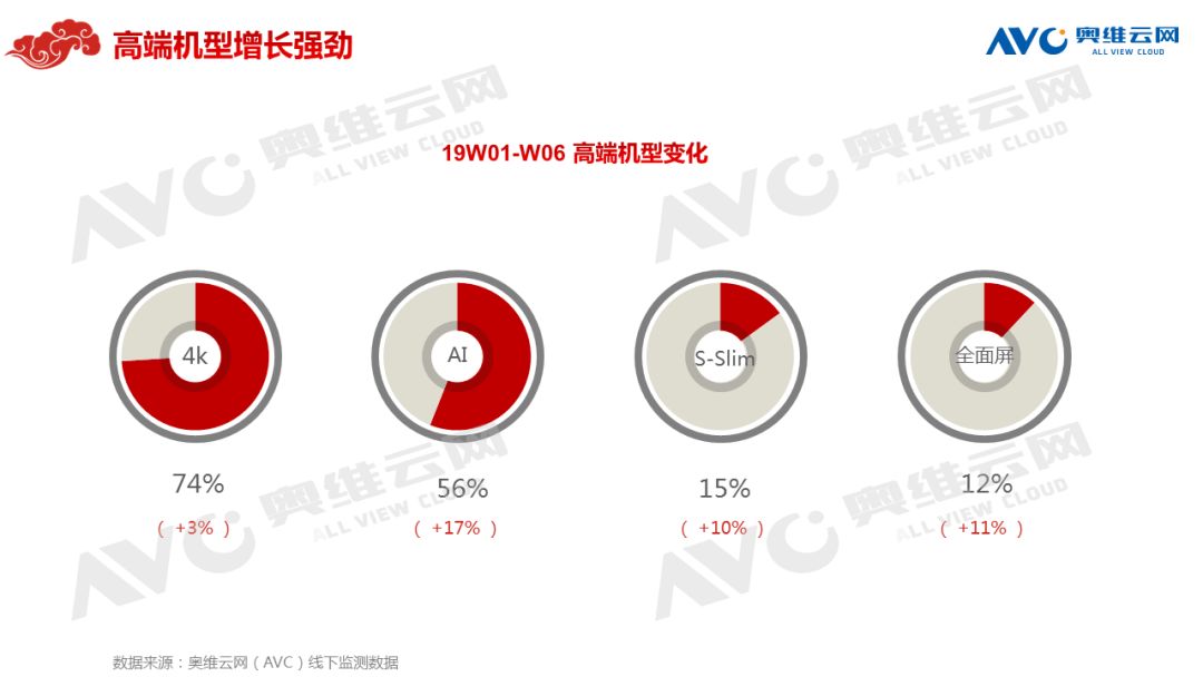 产品结构升级持续,大尺寸市场份额提升,其中65寸电视产品的份额提升最快;高端机型增长强劲,AI电视、超轻薄电视、全面屏电视的份额提升均超10个百分点。