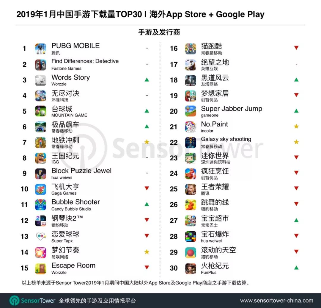 Sensor Tower 商店情报平台最新数据显示,2019年1月期间中国手游产品在海外市场下载量排名TOP30。本月榜单亮点:腾讯《PUBG Mobile》夺得收入榜和下载榜双冠军,常春藤移动旗下4款游戏上榜,2款细分品类新游空降榜单。详细榜单变化如下。