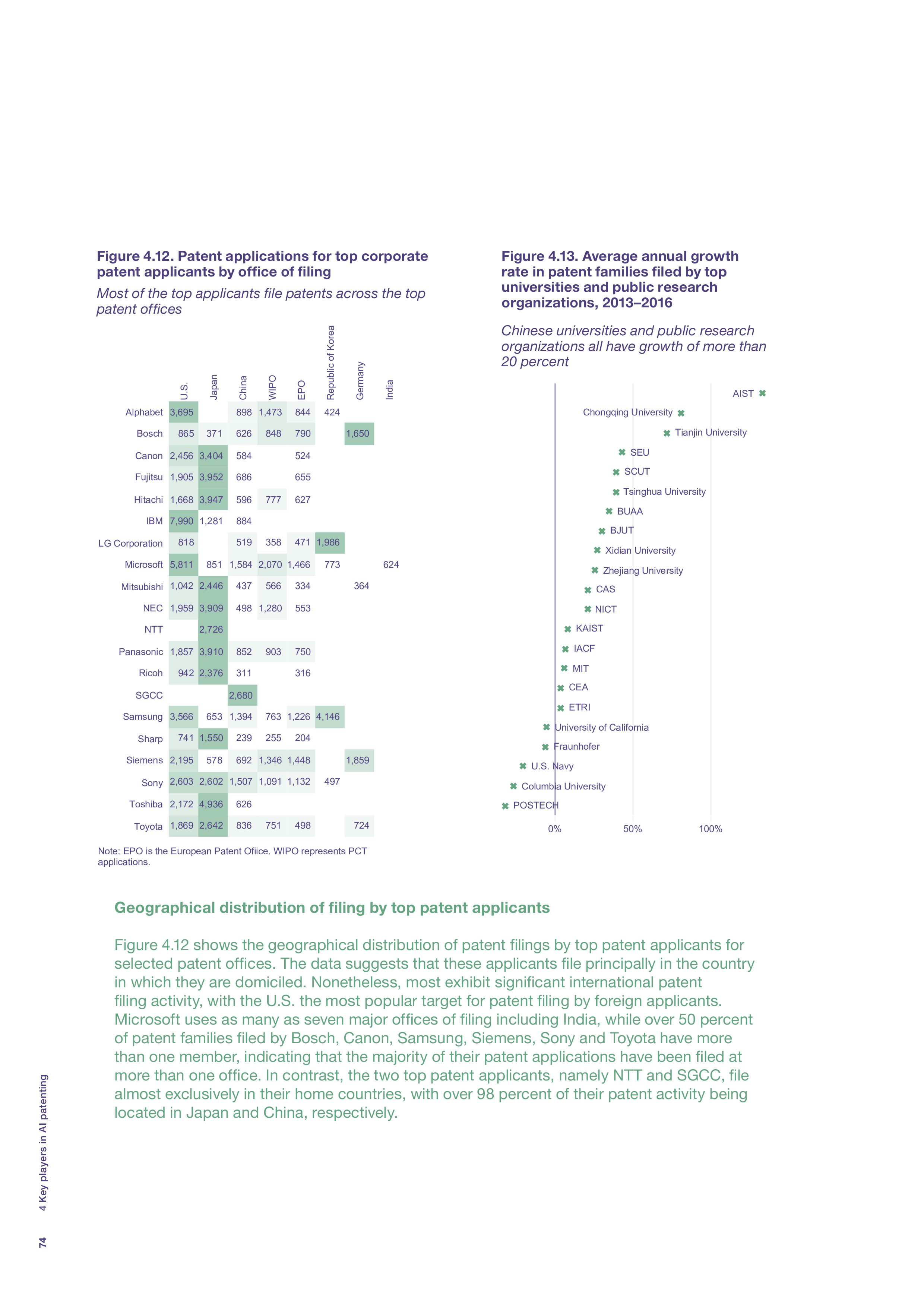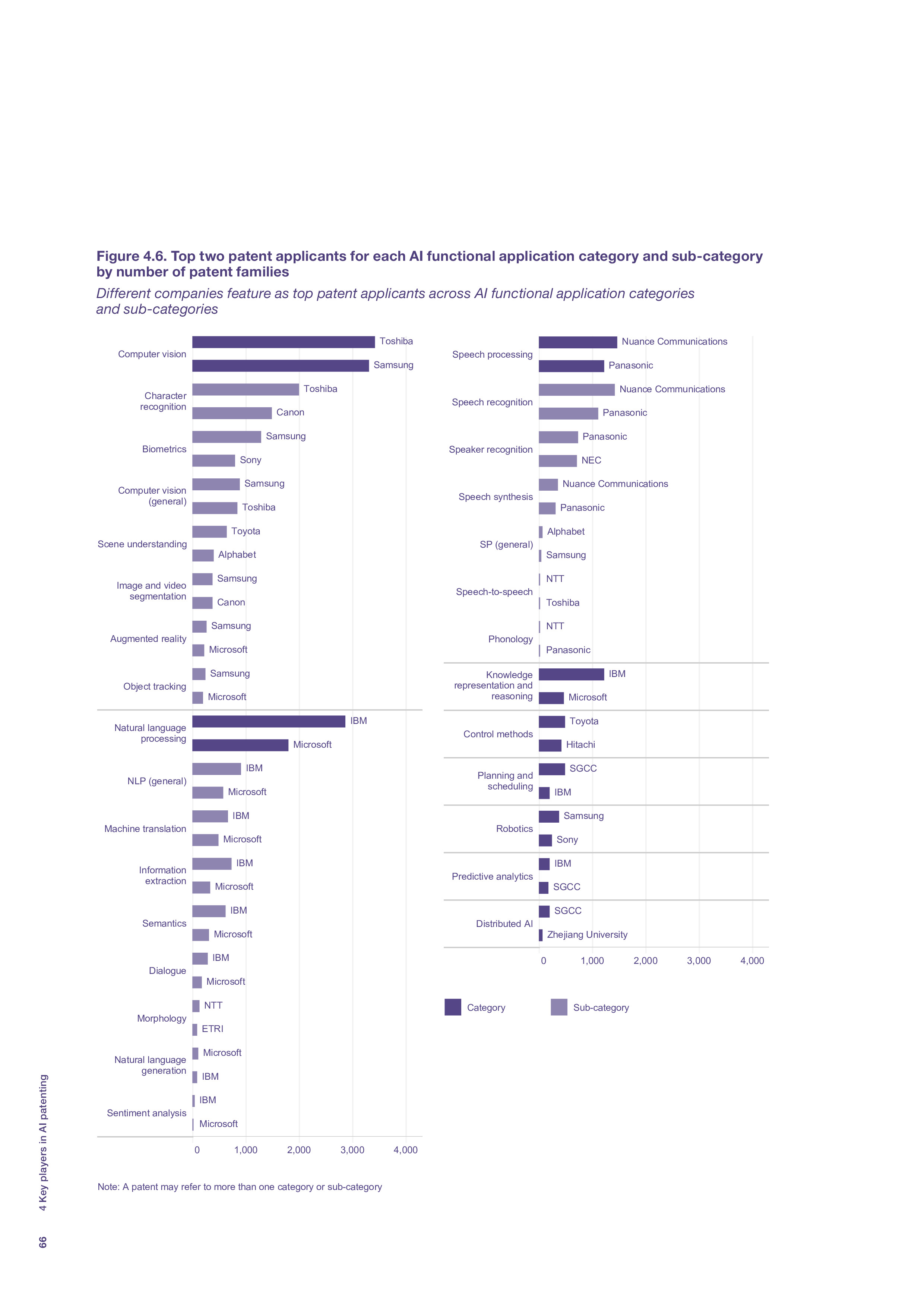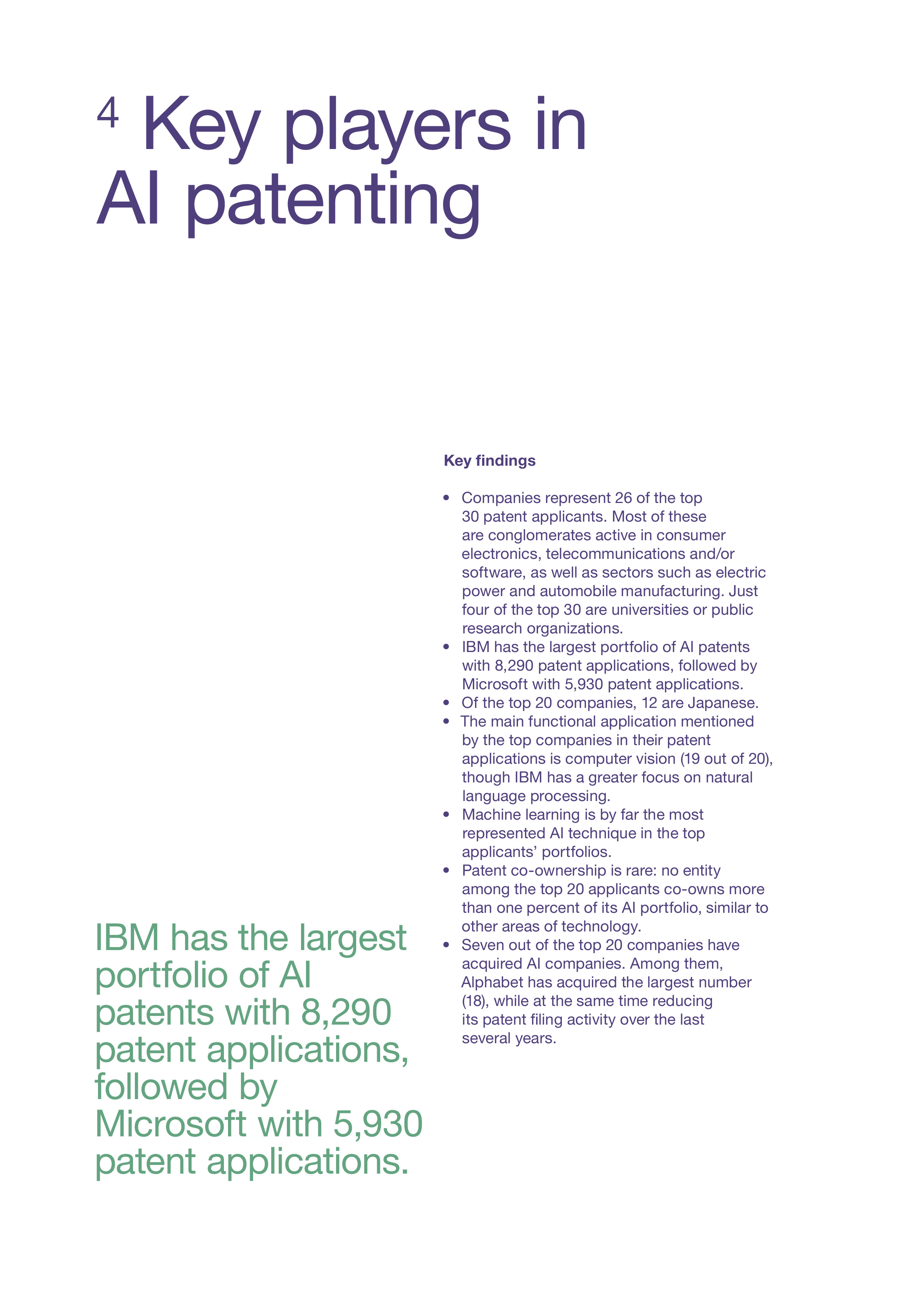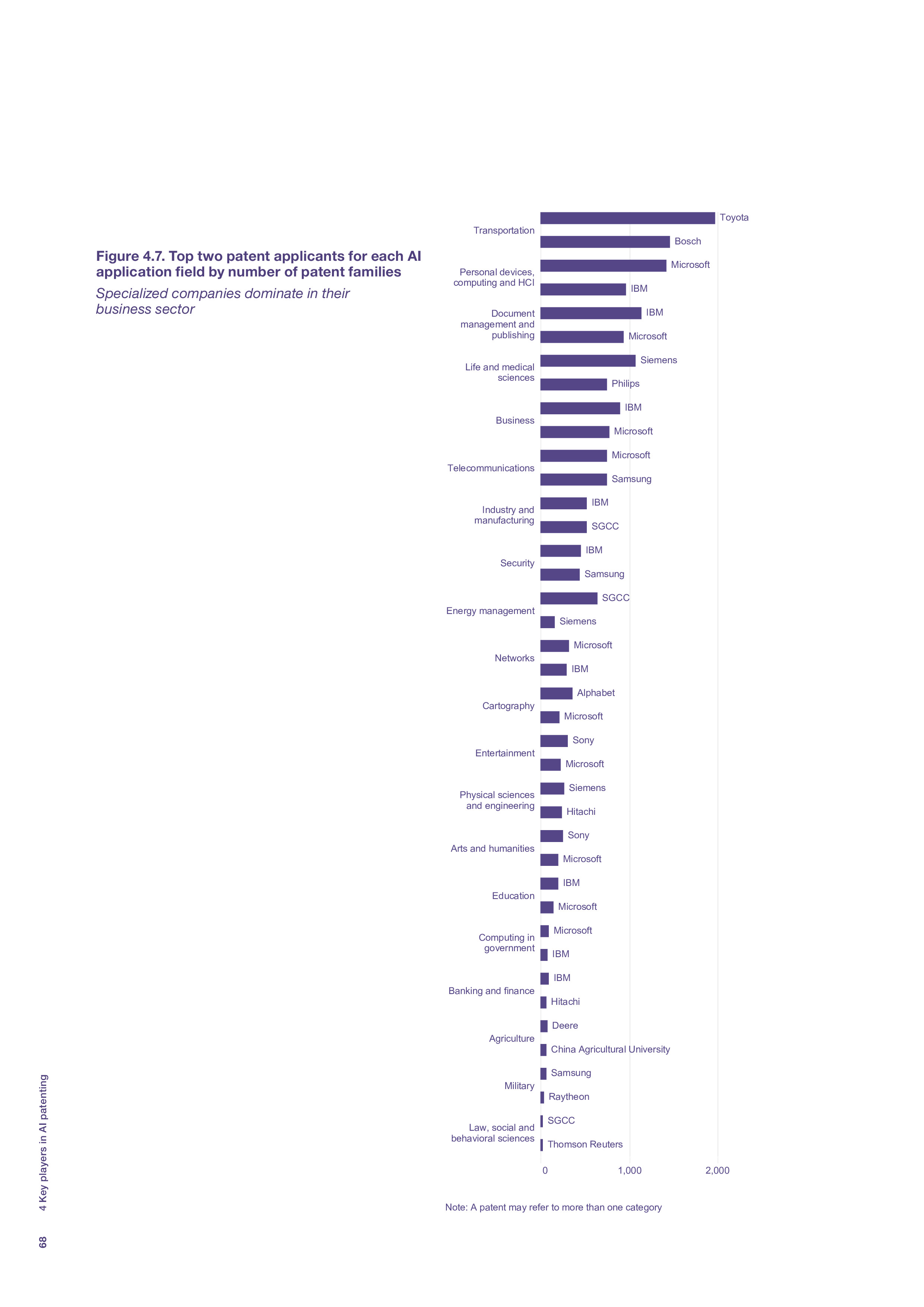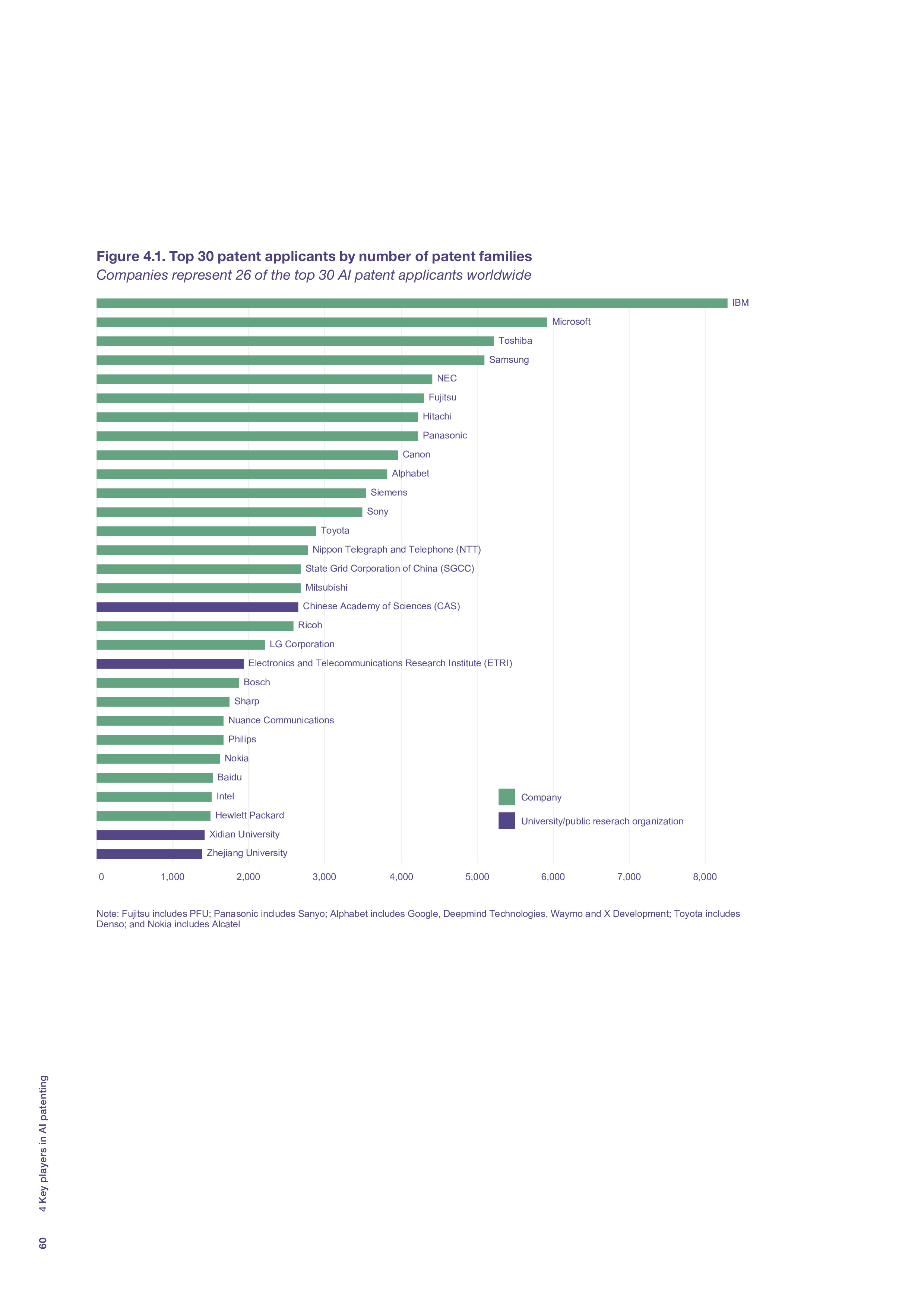 在前30位人工智能专利申请人中,有26家是公司,只有4家是大学或公共研究机构。拥有人工智能相关专利最多的20家公司中有12家位于日本,3家来自美国,2家来自中国。
