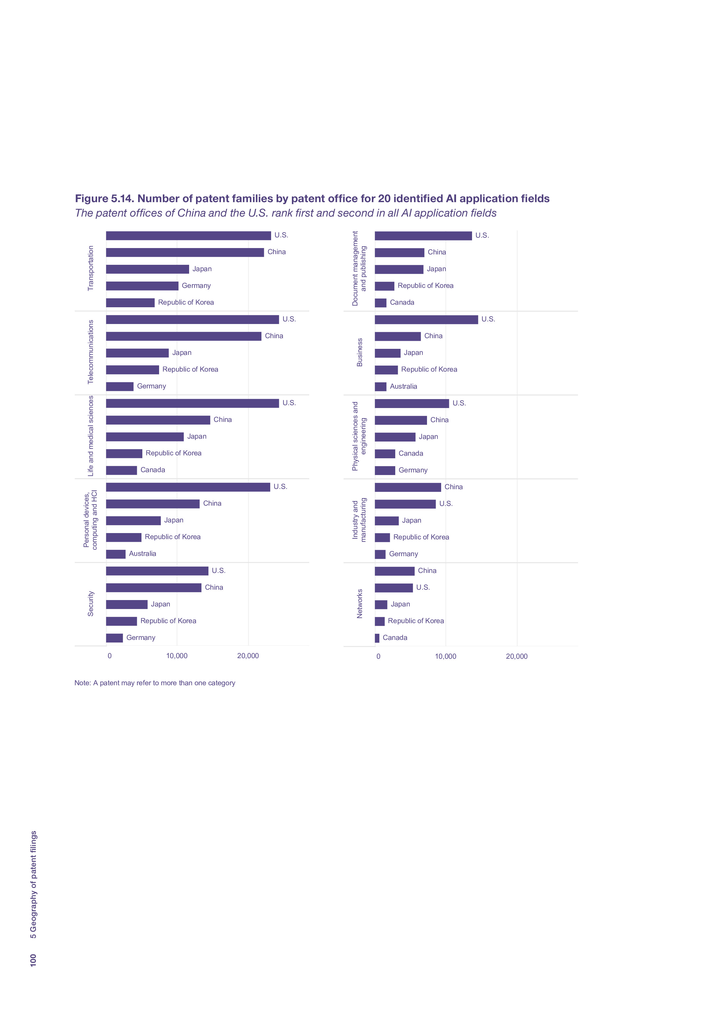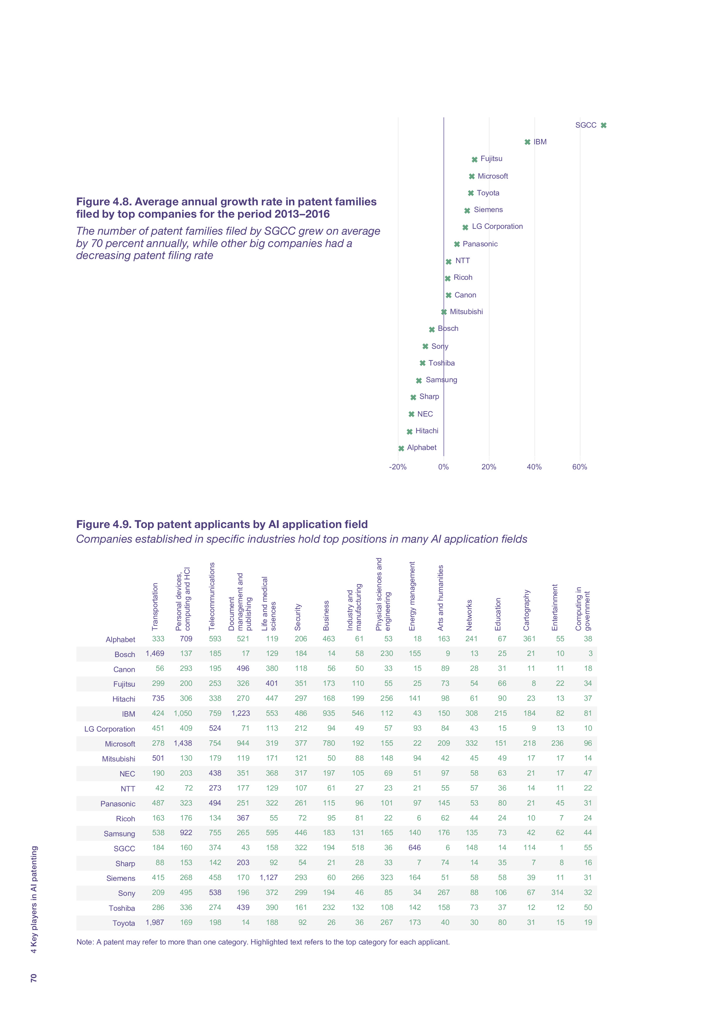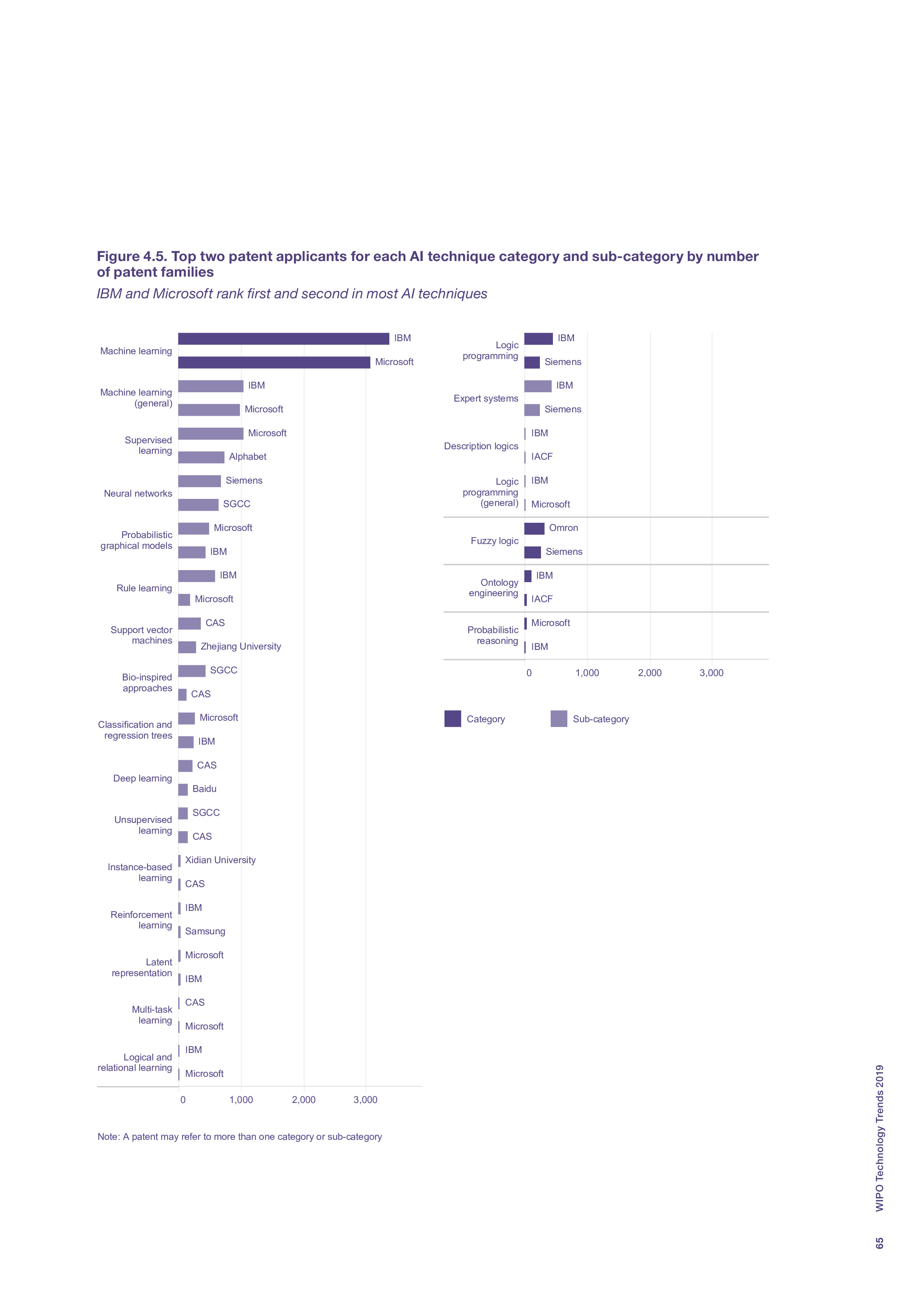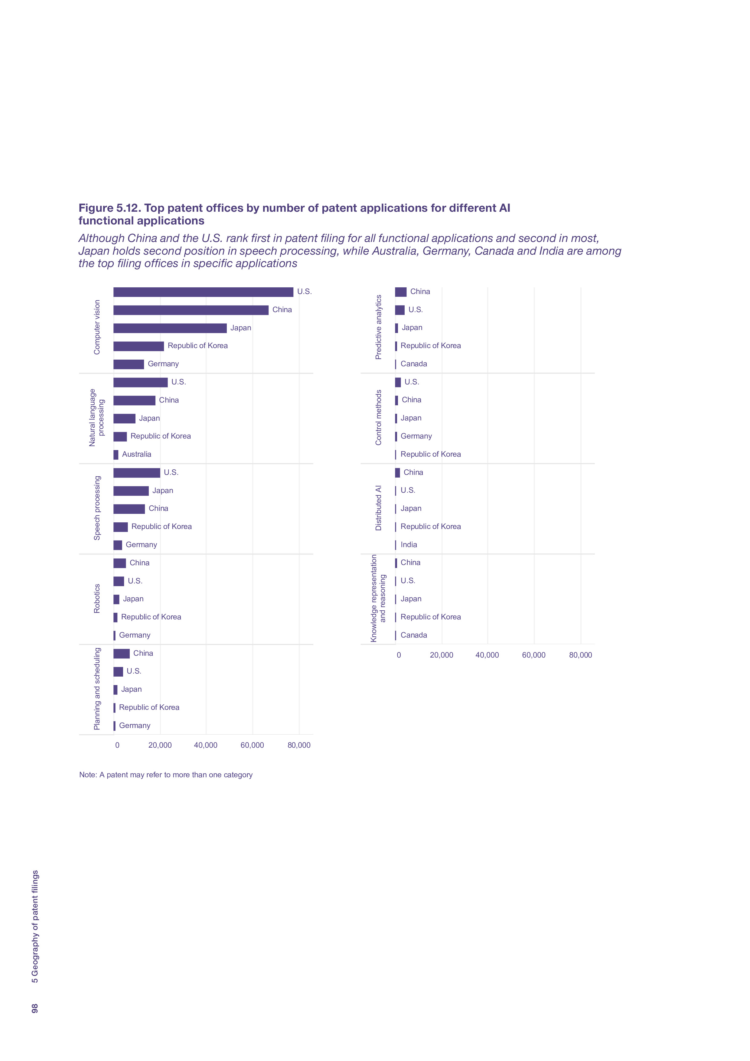 在前30位人工智能专利申请人中,有26家是公司,只有4家是大学或公共研究机构。拥有人工智能相关专利最多的20家公司中有12家位于日本,3家来自美国,2家来自中国。