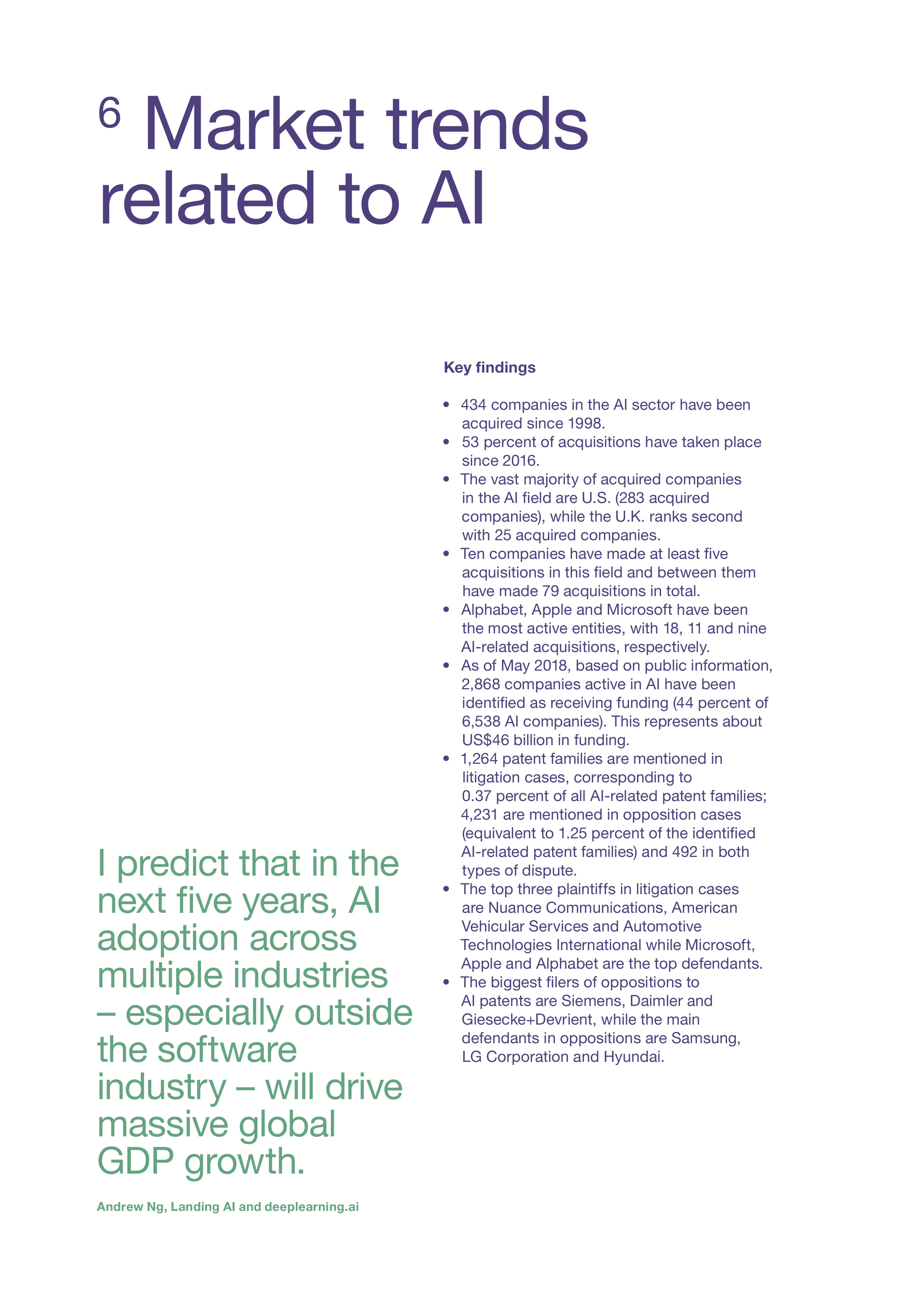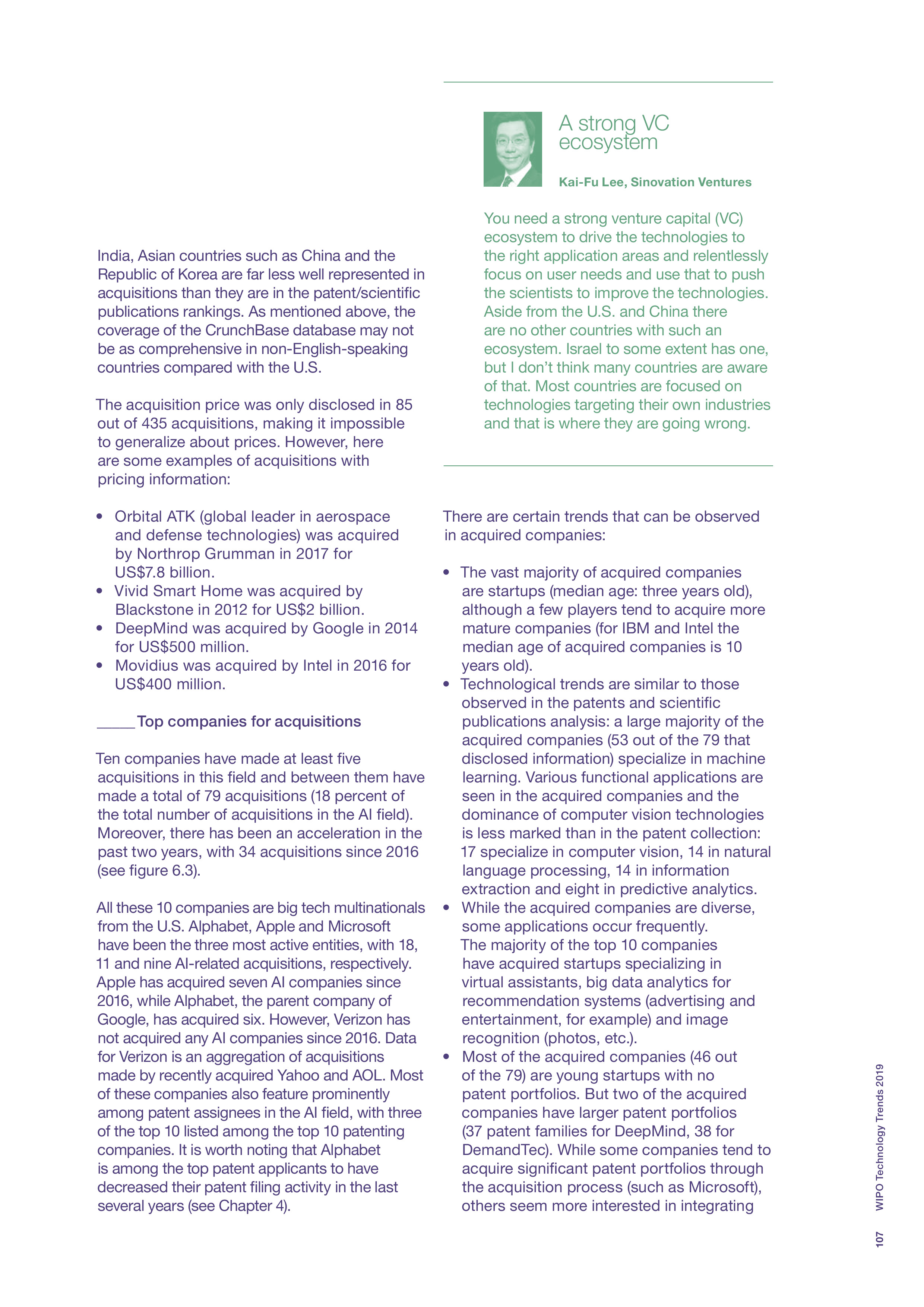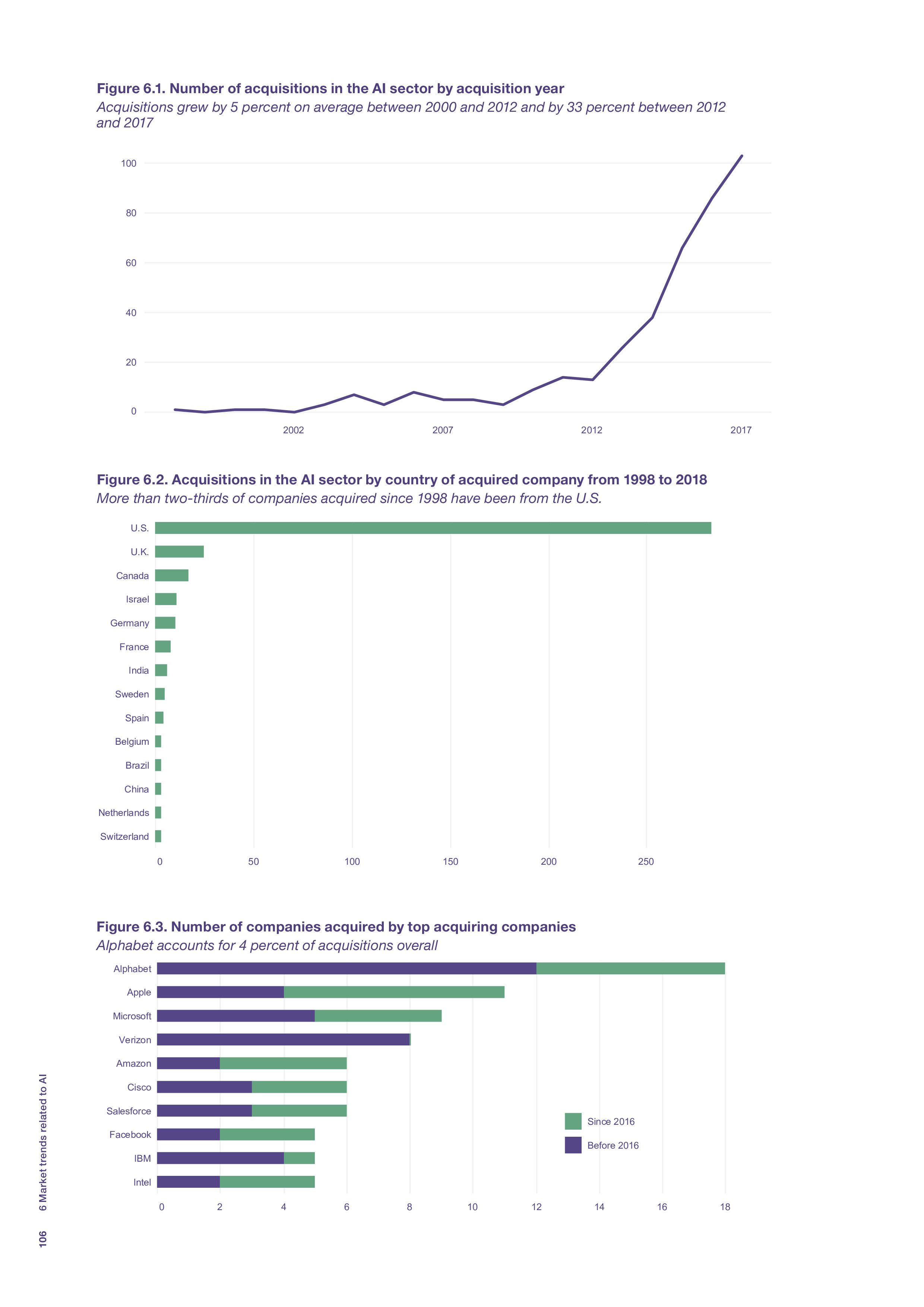 报告还分析了并购活动。自1998年以来,共有434家人工智能公司被收购,其中53%是2016年以来进行的。Alphabet在收购AI公司方面排名第一,苹果和微软也一直在积极收购。
