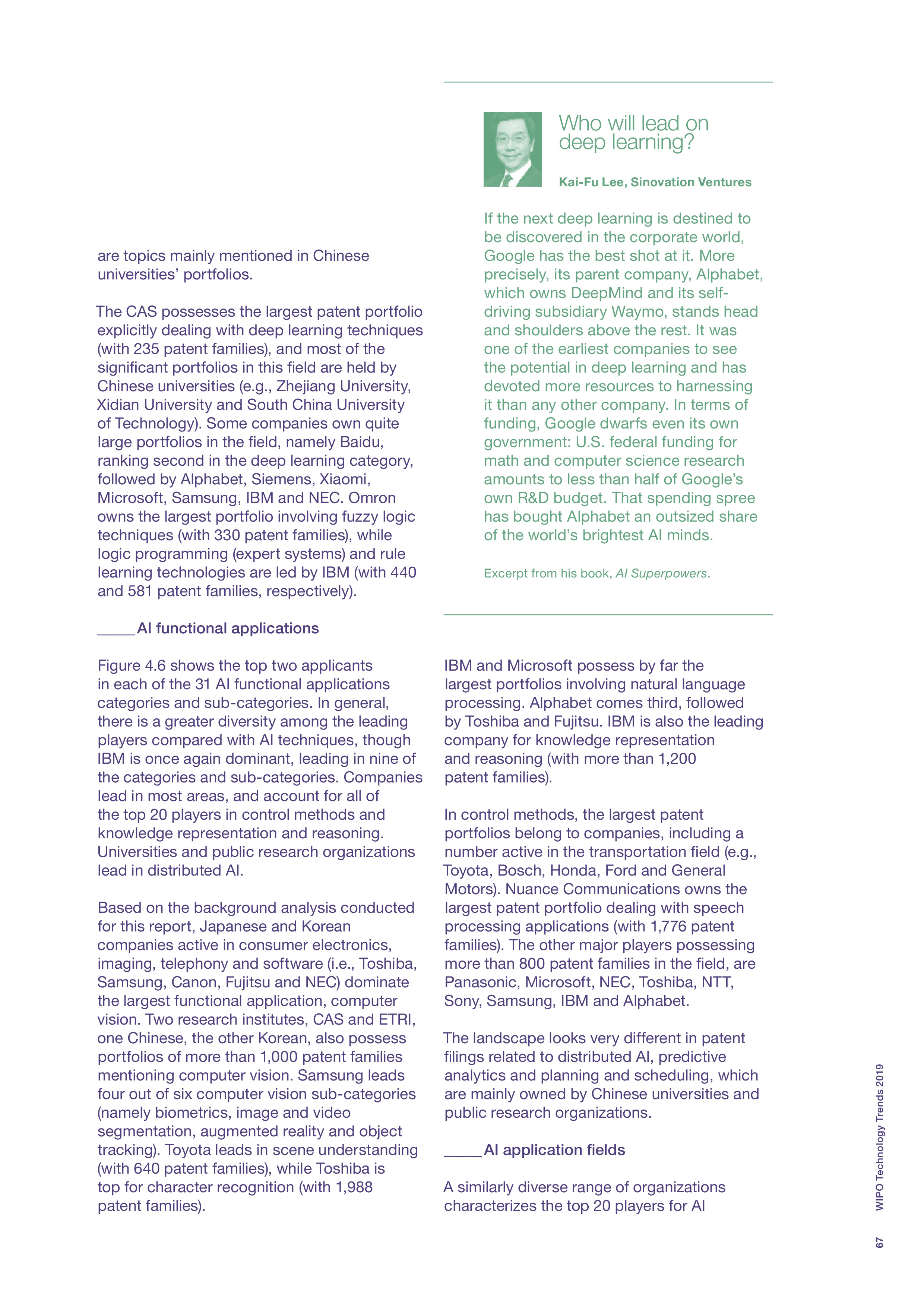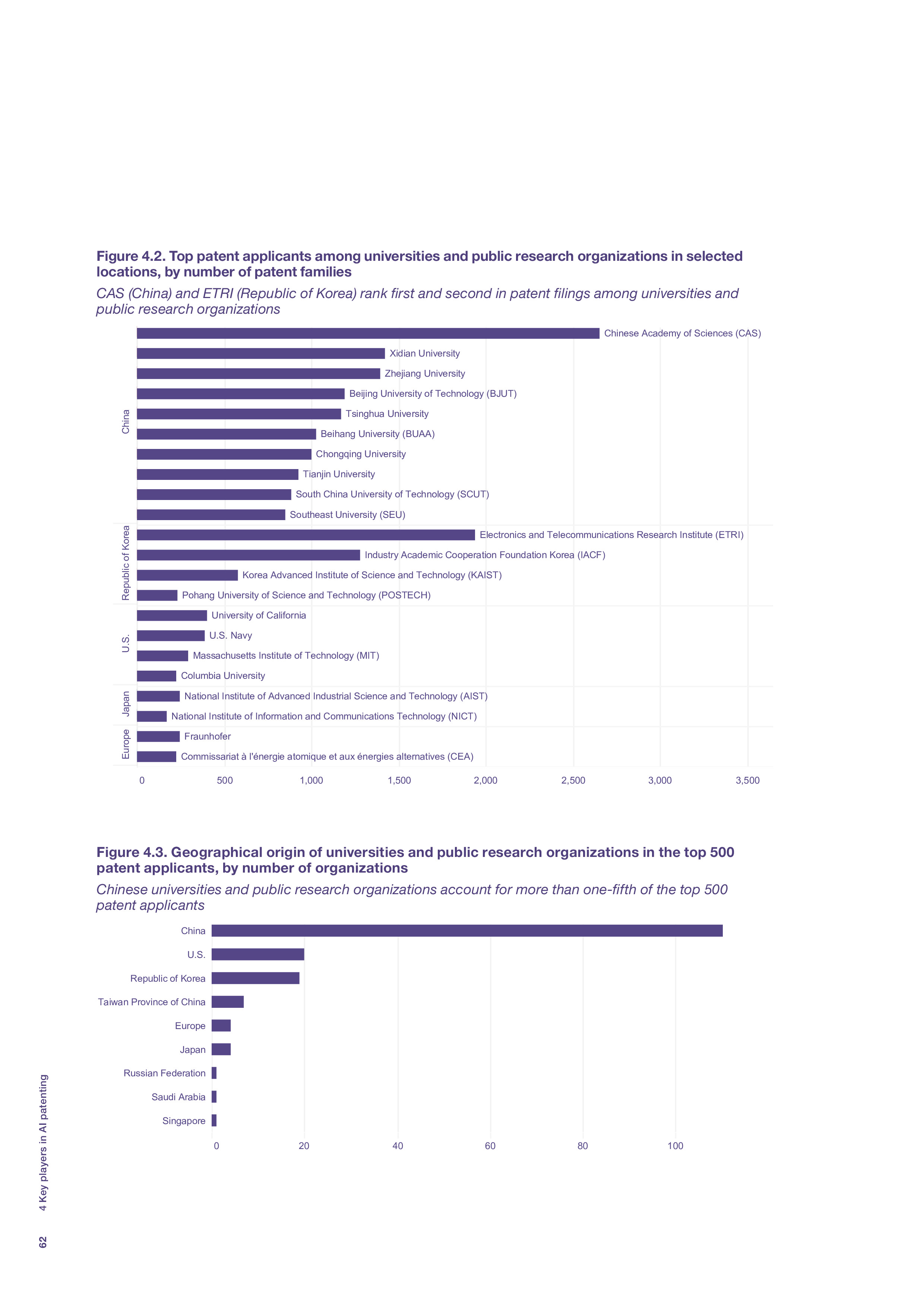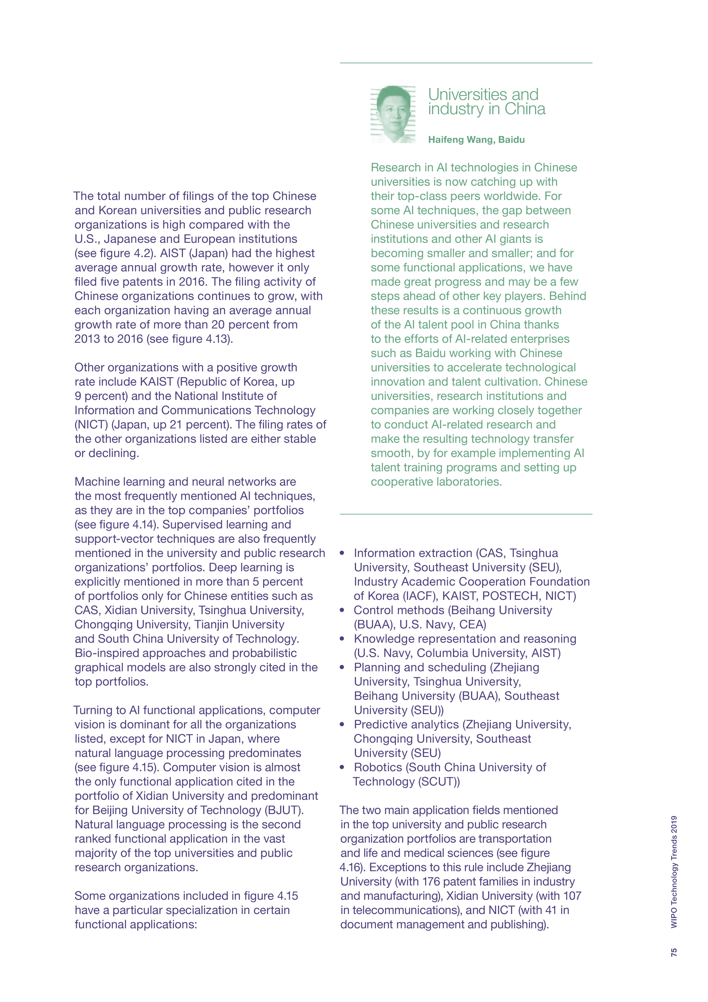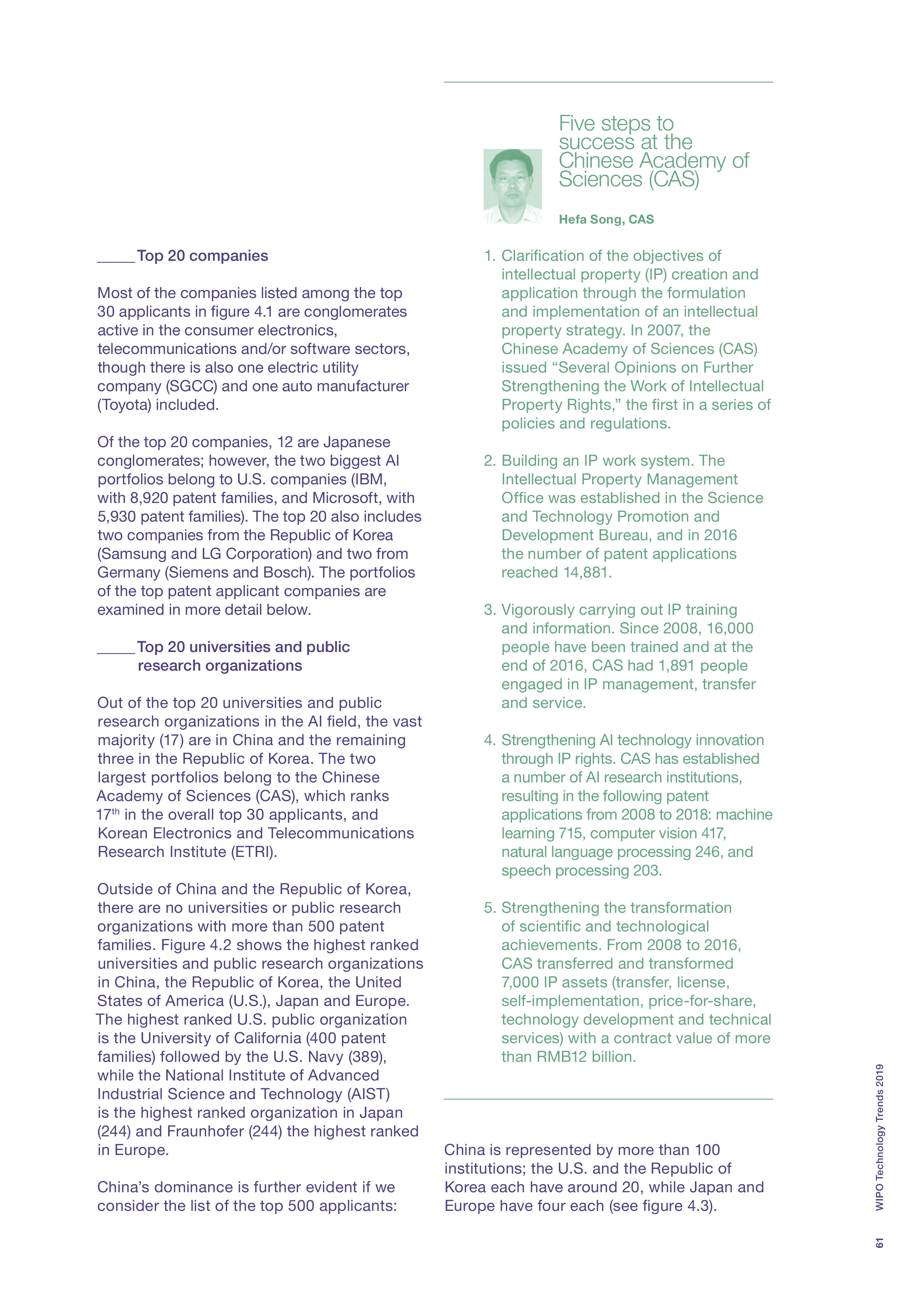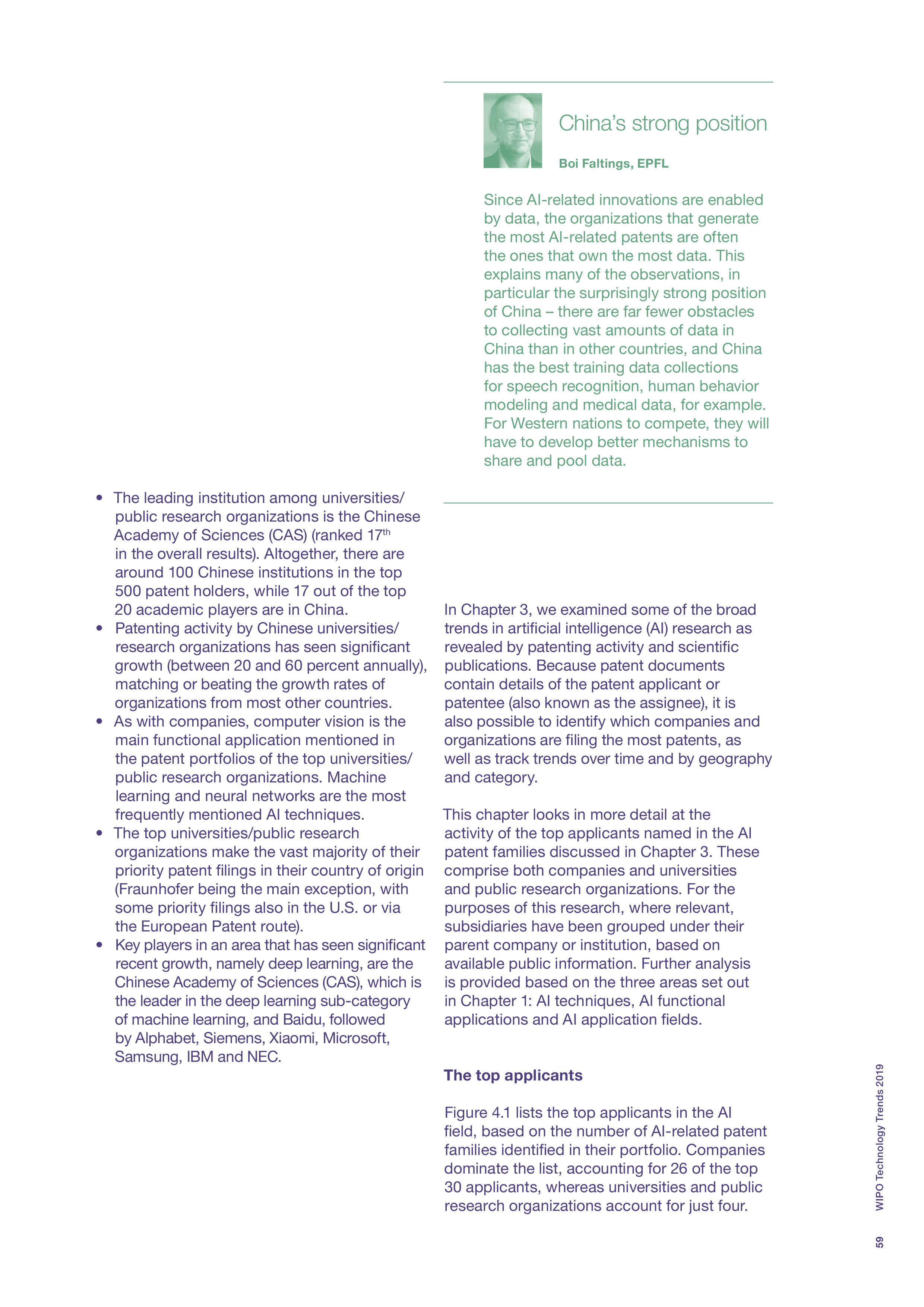 大学对人工智能的研究做出了重要贡献,中国的大学占主导地位。在人工智能专利申请的前20名学术参与者中有17家是中国机构,在与人工智能相关的科技出版物中有10家是中国机构。在新兴的深度学习技术方面,中国尤其强大。主要的公共研究机构是中国科学院(CAS),拥有2500多个专利组合,发表了2万多篇人工智能科学论文。而且,CAS拥有最大的深度学习组合(235个专利家族)。中国企业正在巩固领先地位,2013-2016年,专利投资平均每年增长20%以上。