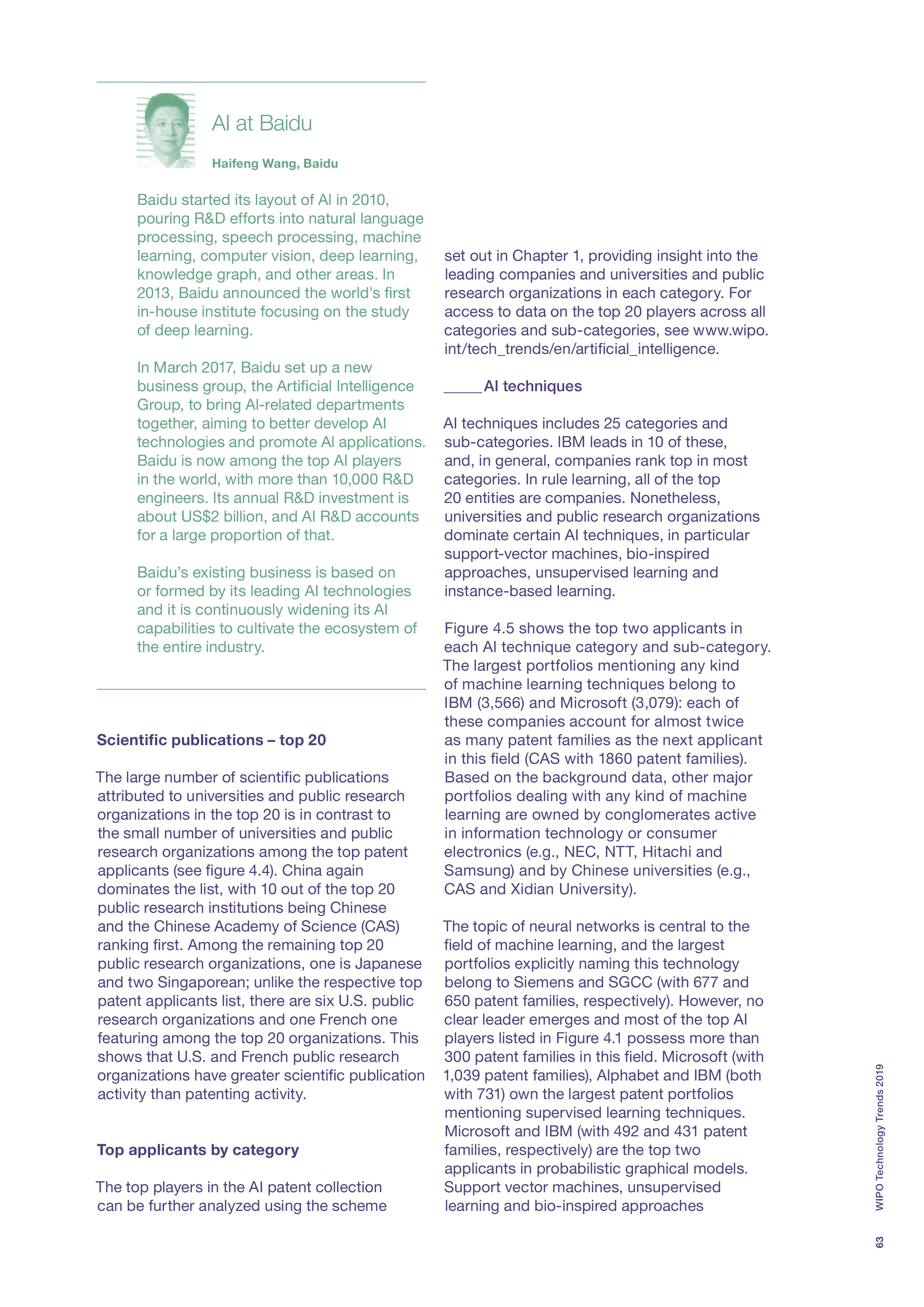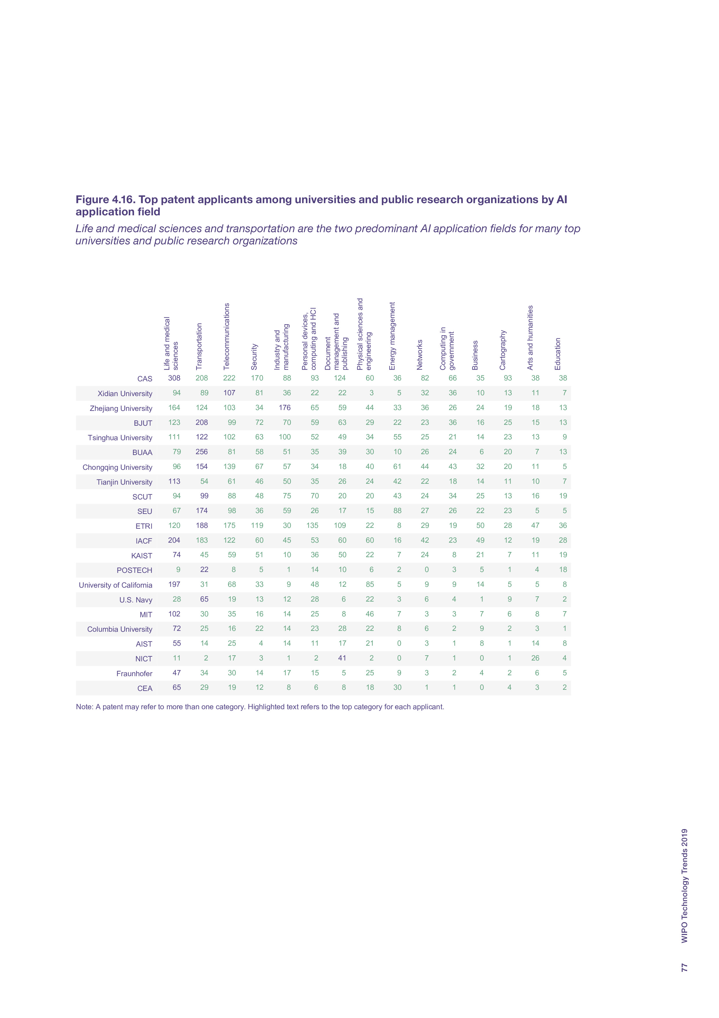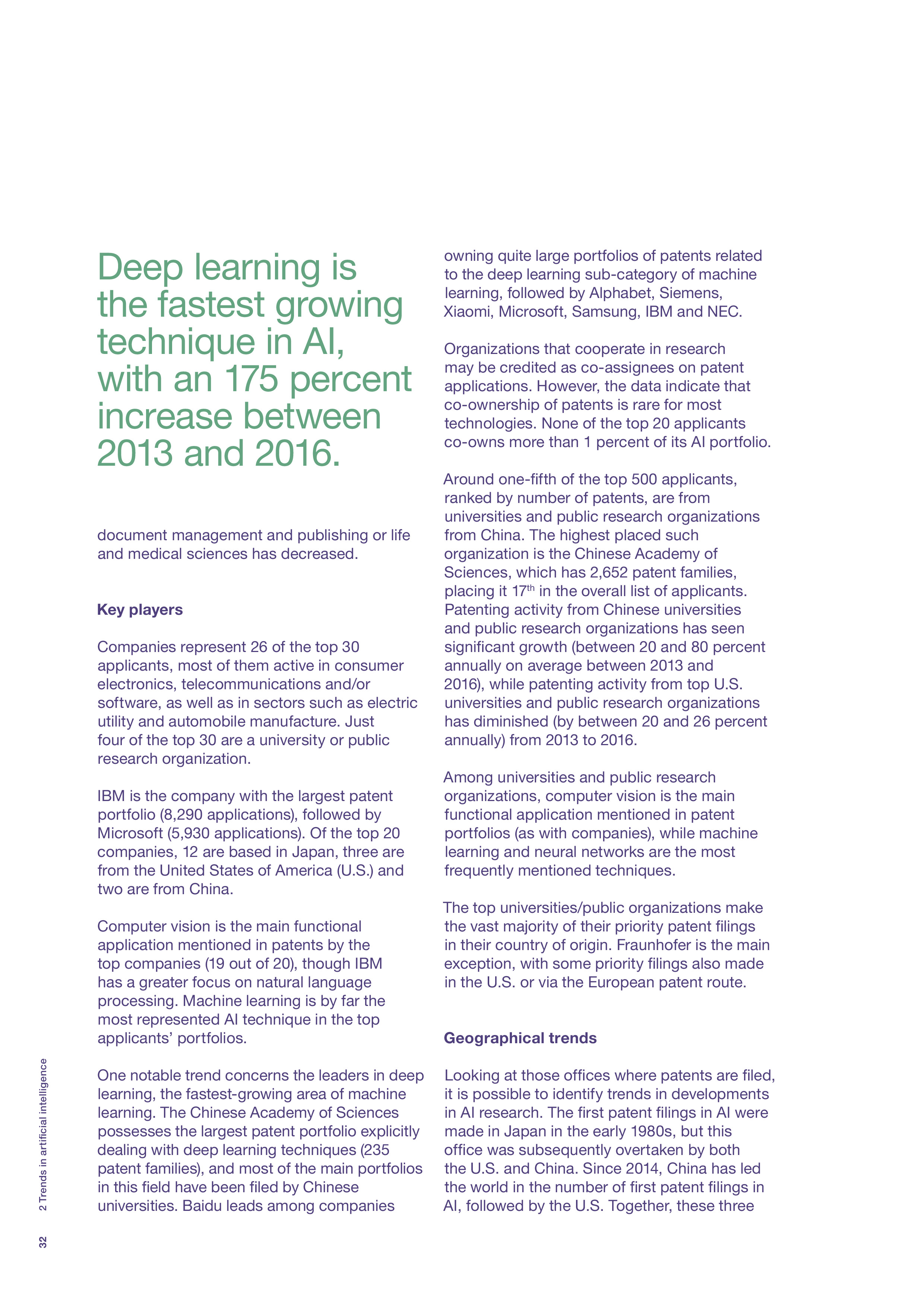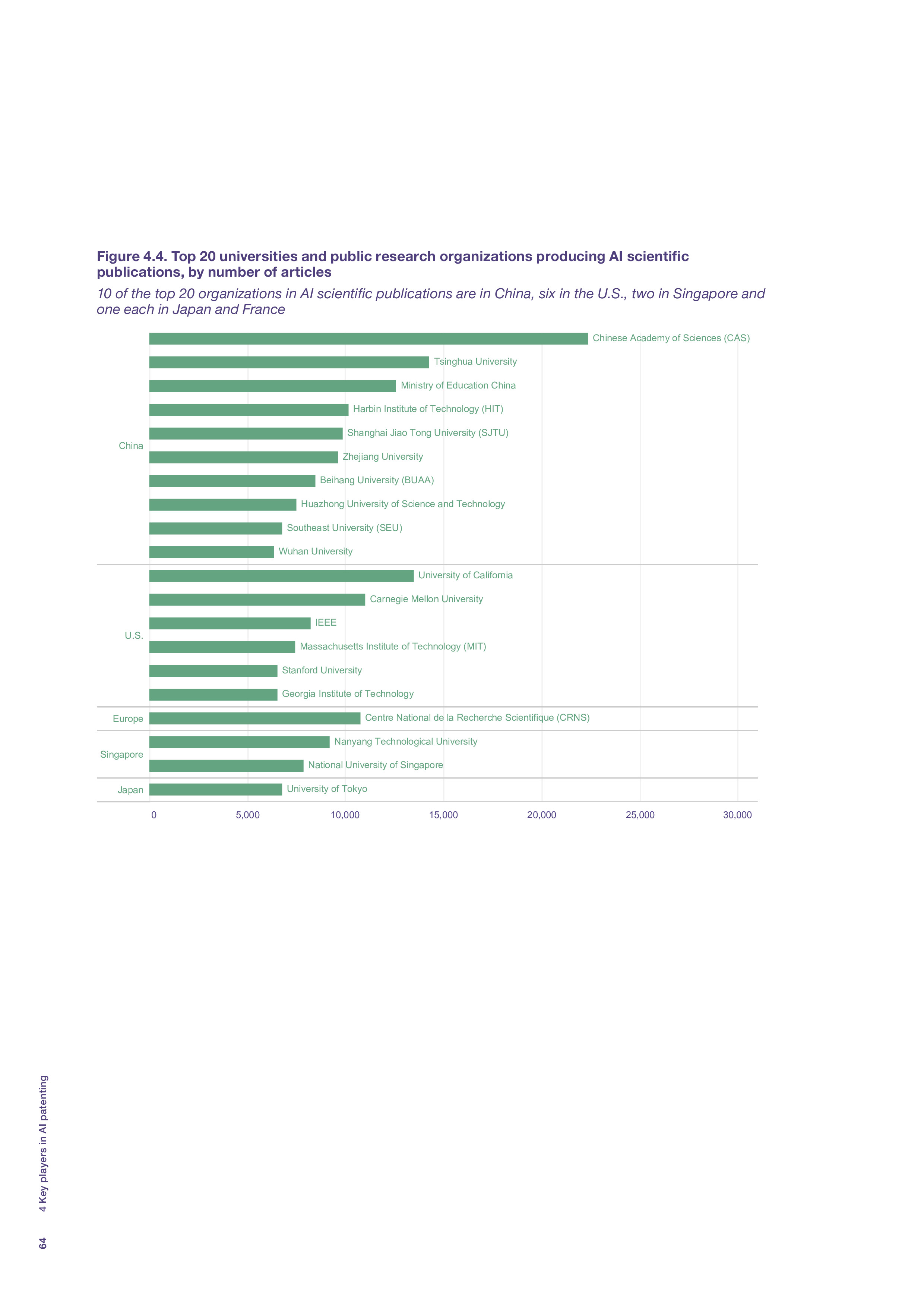 大学对人工智能的研究做出了重要贡献,中国的大学占主导地位。在人工智能专利申请的前20名学术参与者中有17家是中国机构,在与人工智能相关的科技出版物中有10家是中国机构。在新兴的深度学习技术方面,中国尤其强大。主要的公共研究机构是中国科学院(CAS),拥有2500多个专利组合,发表了2万多篇人工智能科学论文。而且,CAS拥有最大的深度学习组合(235个专利家族)。中国企业正在巩固领先地位,2013-2016年,专利投资平均每年增长20%以上。