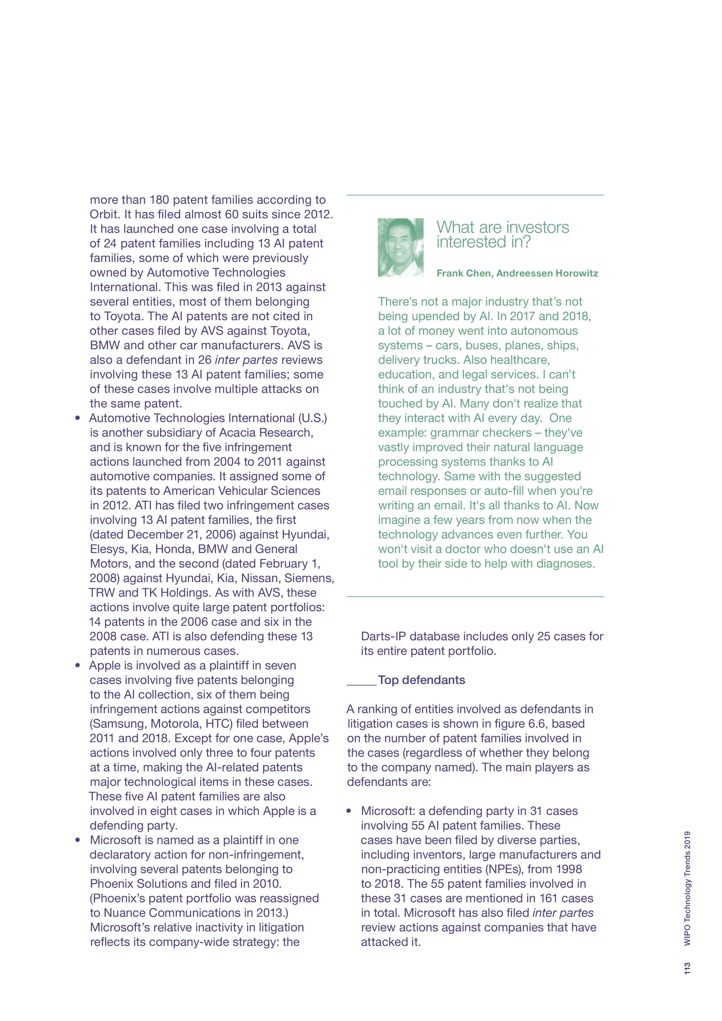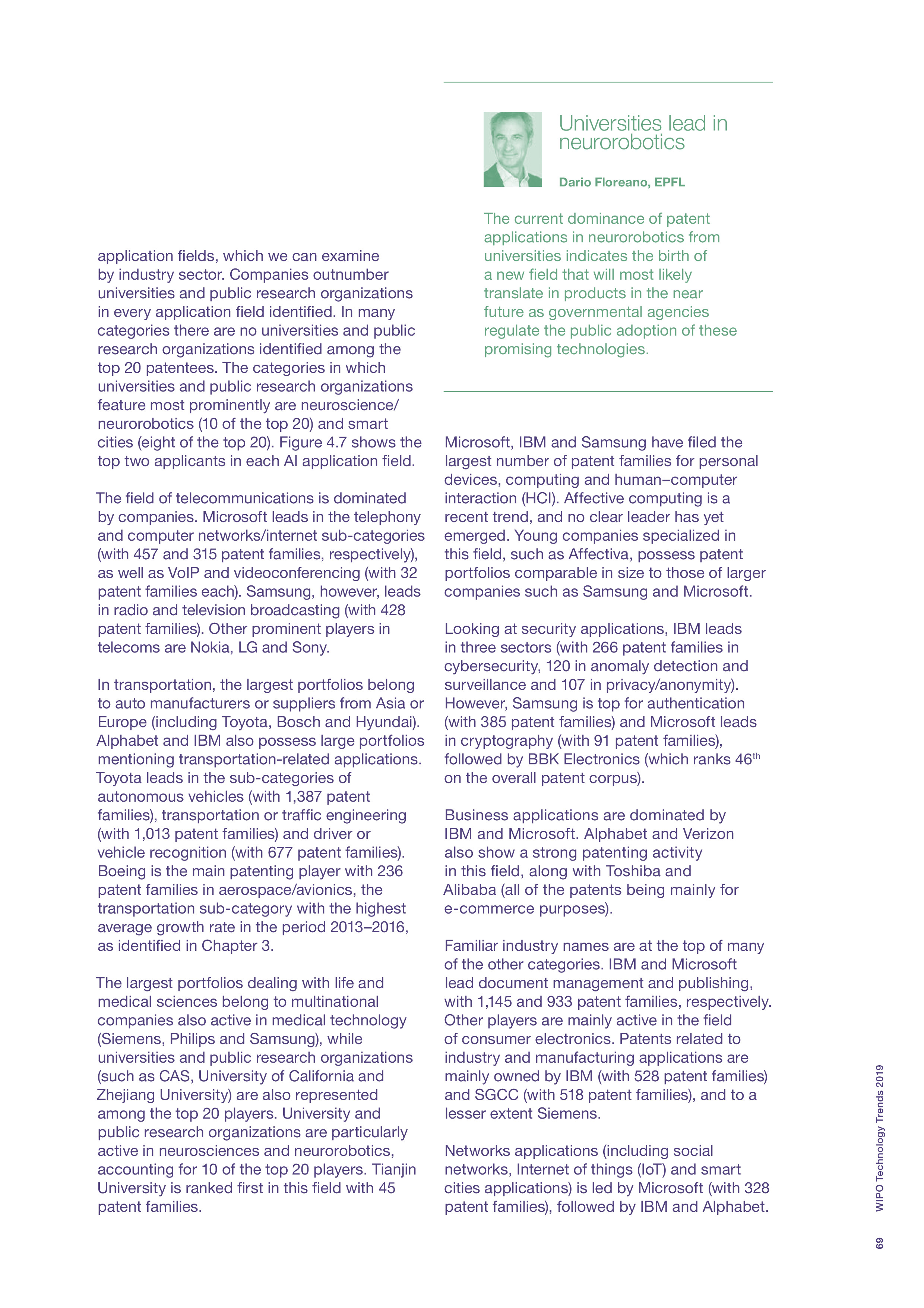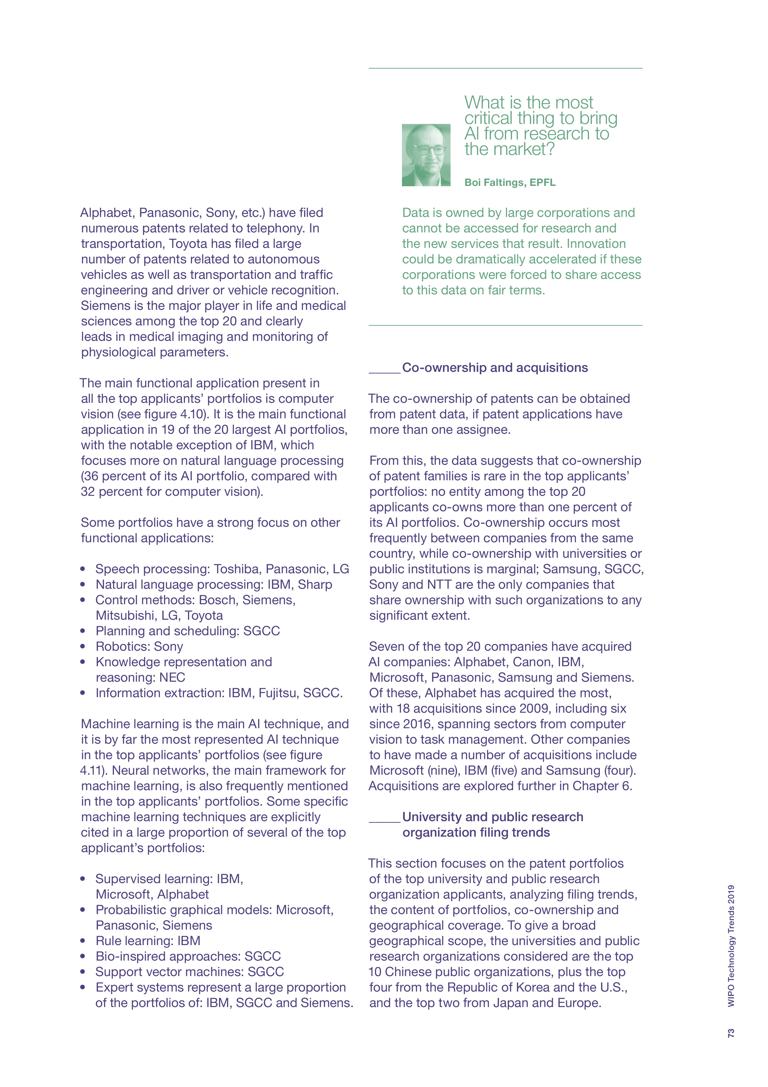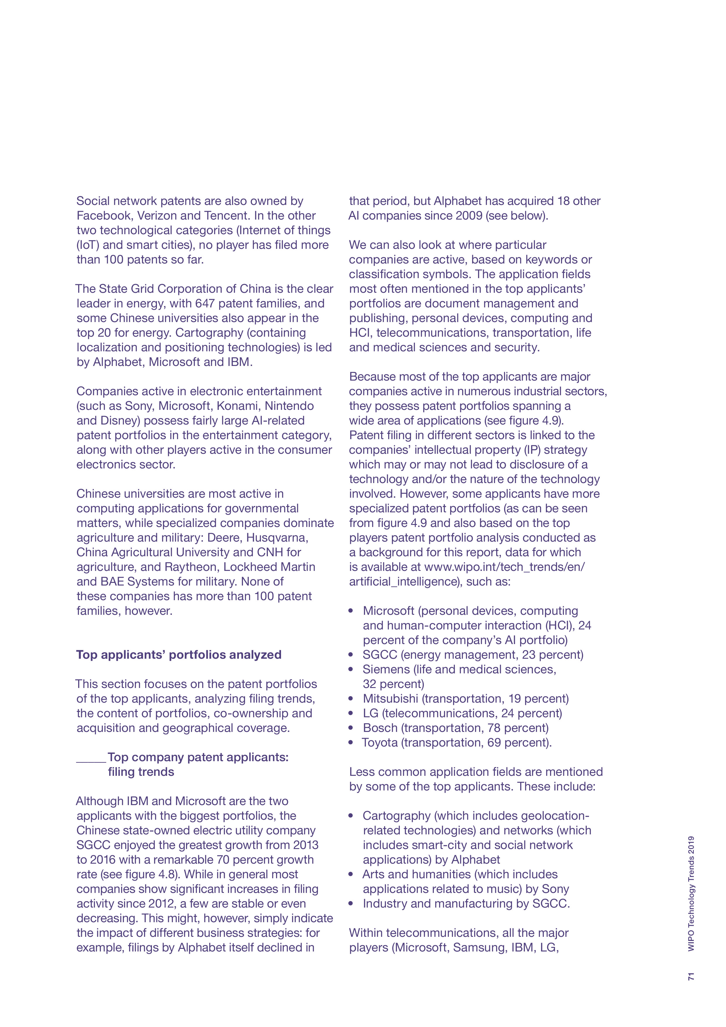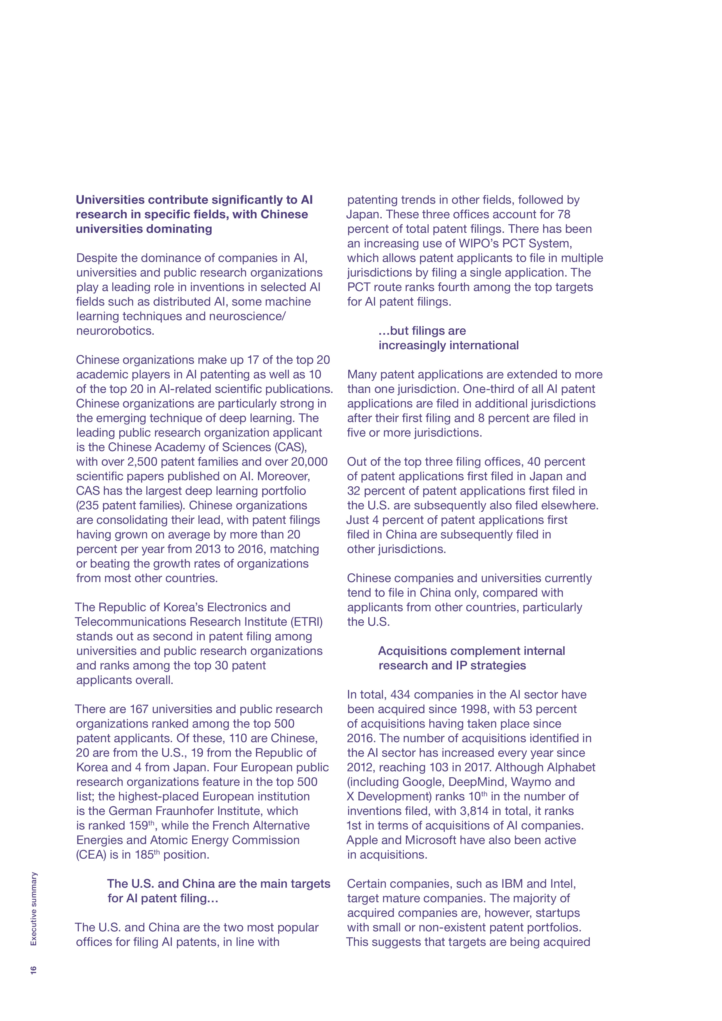 大学对人工智能的研究做出了重要贡献,中国的大学占主导地位。在人工智能专利申请的前20名学术参与者中有17家是中国机构,在与人工智能相关的科技出版物中有10家是中国机构。在新兴的深度学习技术方面,中国尤其强大。主要的公共研究机构是中国科学院(CAS),拥有2500多个专利组合,发表了2万多篇人工智能科学论文。而且,CAS拥有最大的深度学习组合(235个专利家族)。中国企业正在巩固领先地位,2013-2016年,专利投资平均每年增长20%以上。