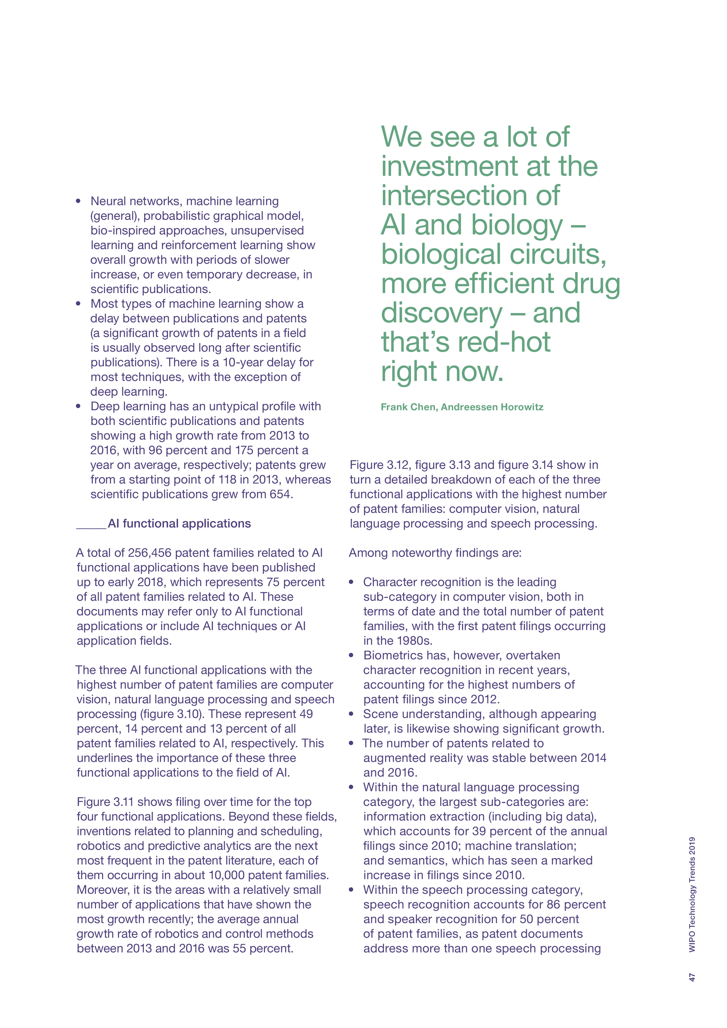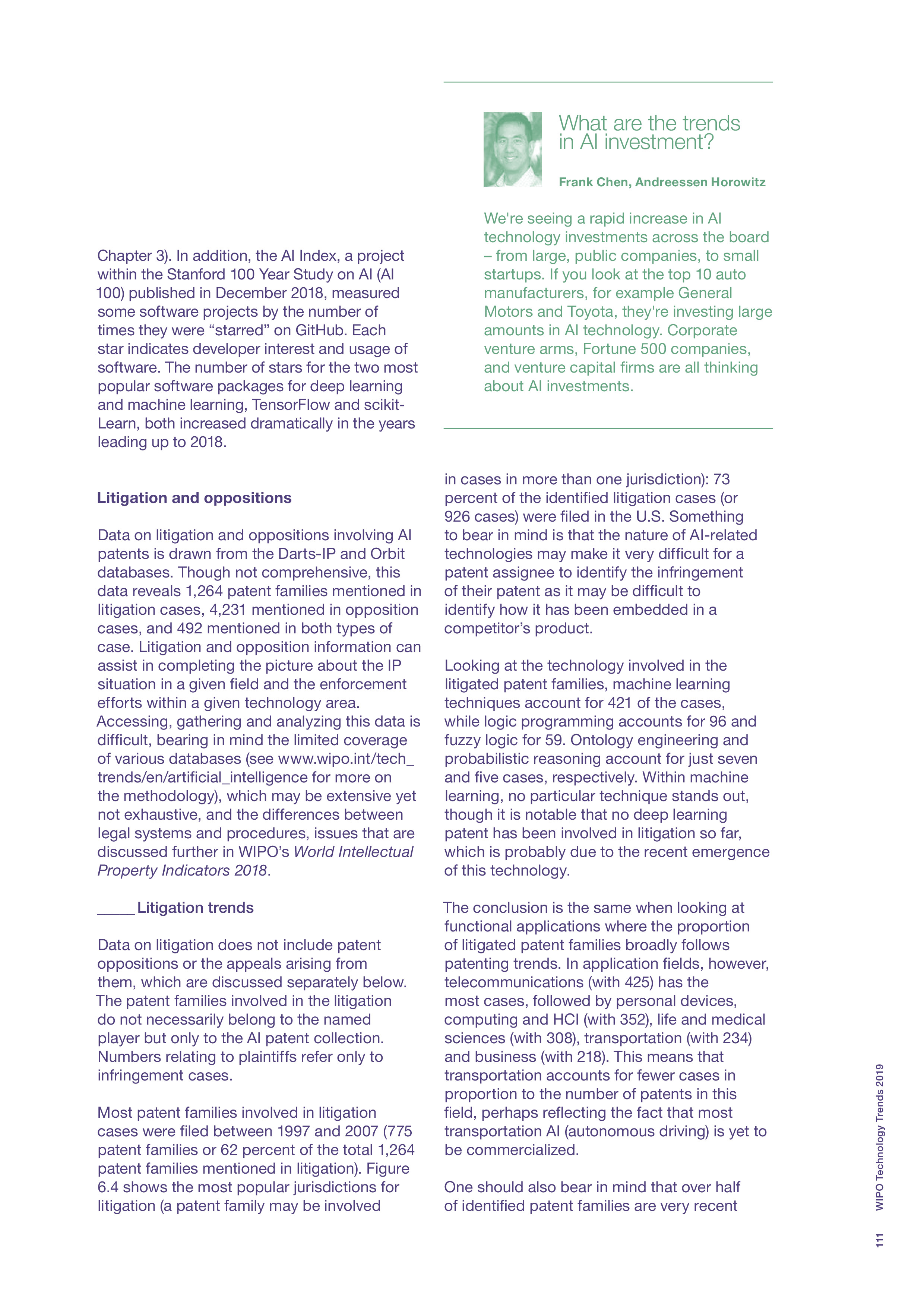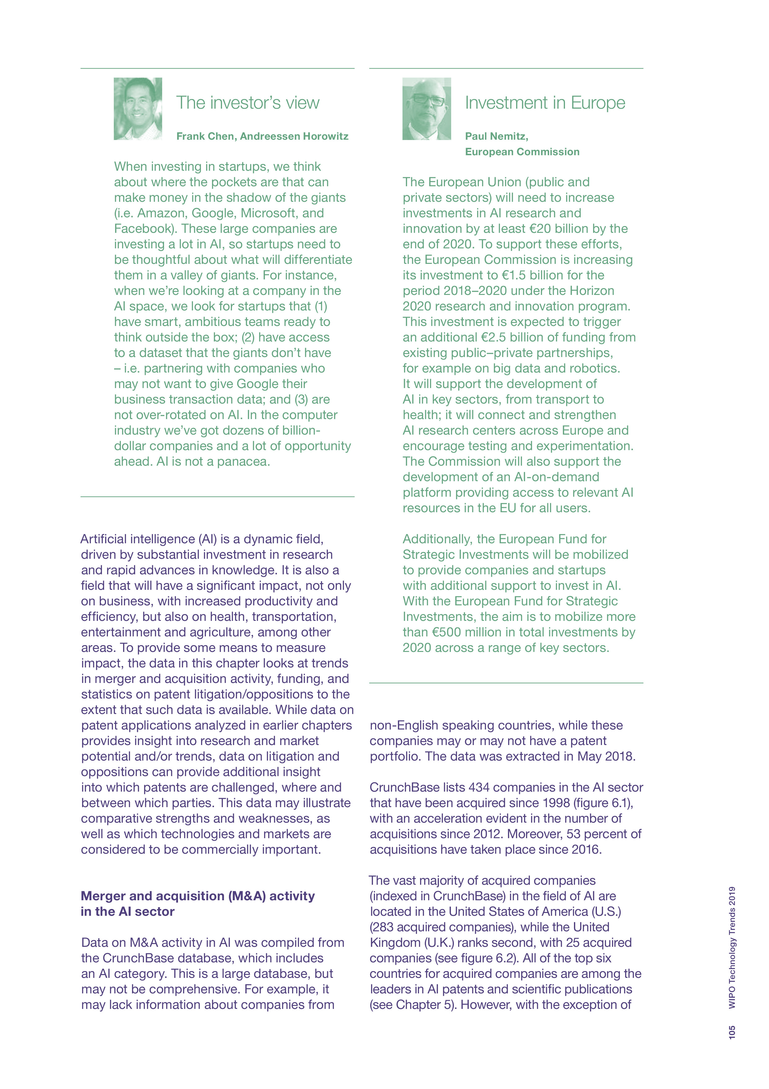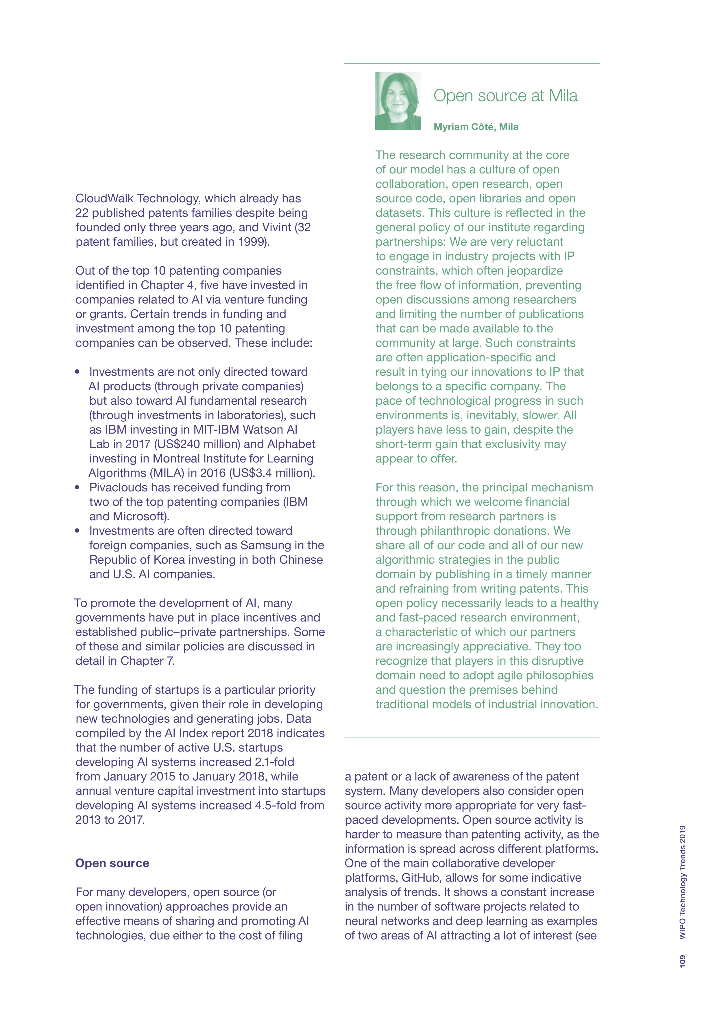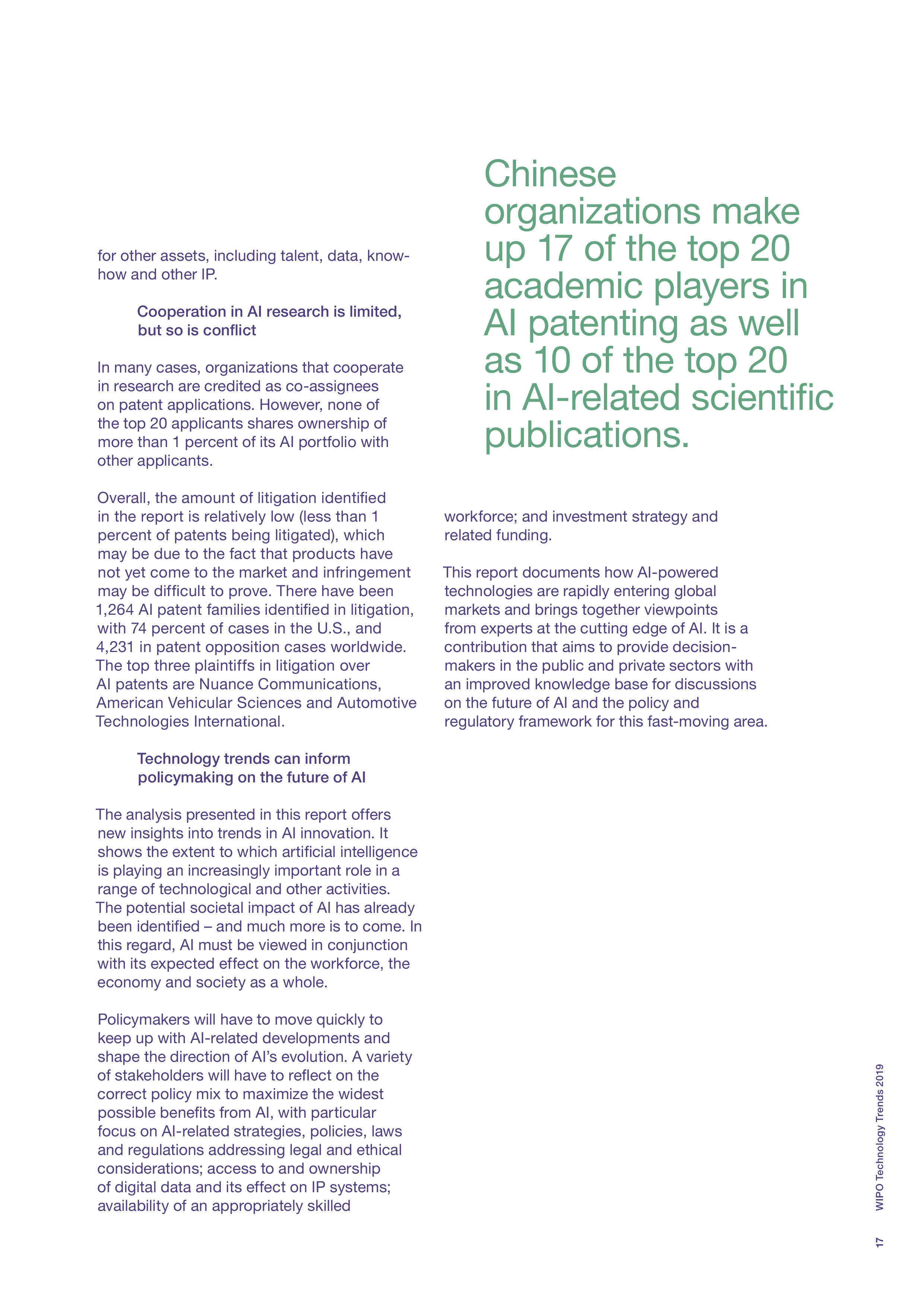 大学对人工智能的研究做出了重要贡献,中国的大学占主导地位。在人工智能专利申请的前20名学术参与者中有17家是中国机构,在与人工智能相关的科技出版物中有10家是中国机构。在新兴的深度学习技术方面,中国尤其强大。主要的公共研究机构是中国科学院(CAS),拥有2500多个专利组合,发表了2万多篇人工智能科学论文。而且,CAS拥有最大的深度学习组合(235个专利家族)。中国企业正在巩固领先地位,2013-2016年,专利投资平均每年增长20%以上。