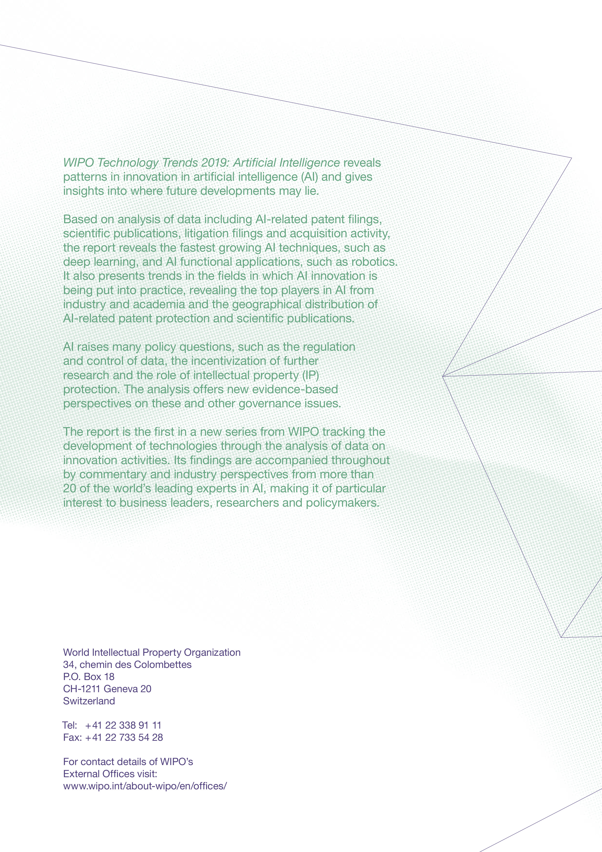 WIPO发布了新报告“2019年科技趋势之人工智能”。人工智能(AI)正日益推动技术发展,从自动驾驶汽车到医学诊断,再到先进制造。