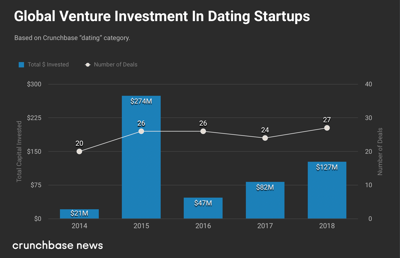 2018年约会相关的27家初创企业共获得1.27亿美元风险投资,与全球各行业超过3000亿美元的风险投资相比微不足道。