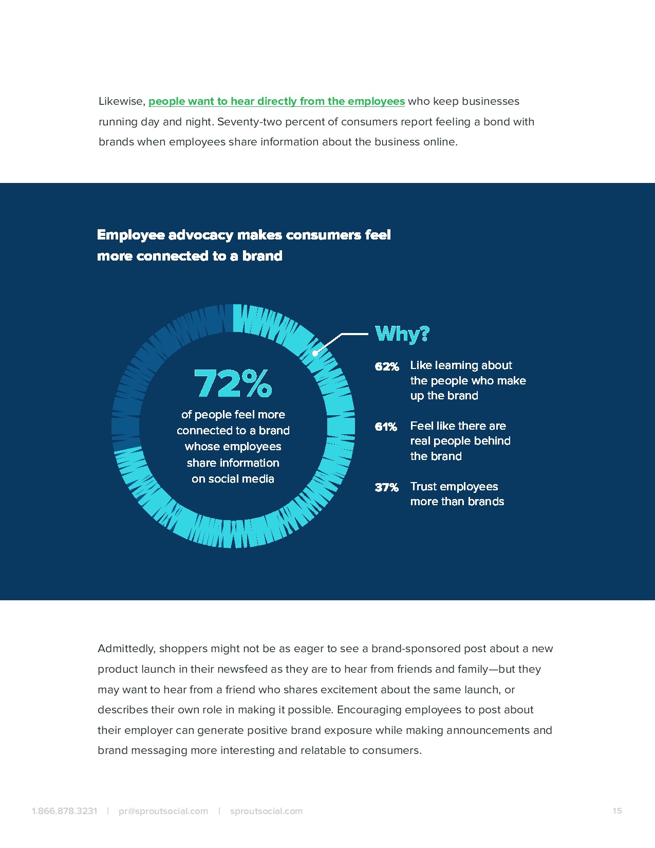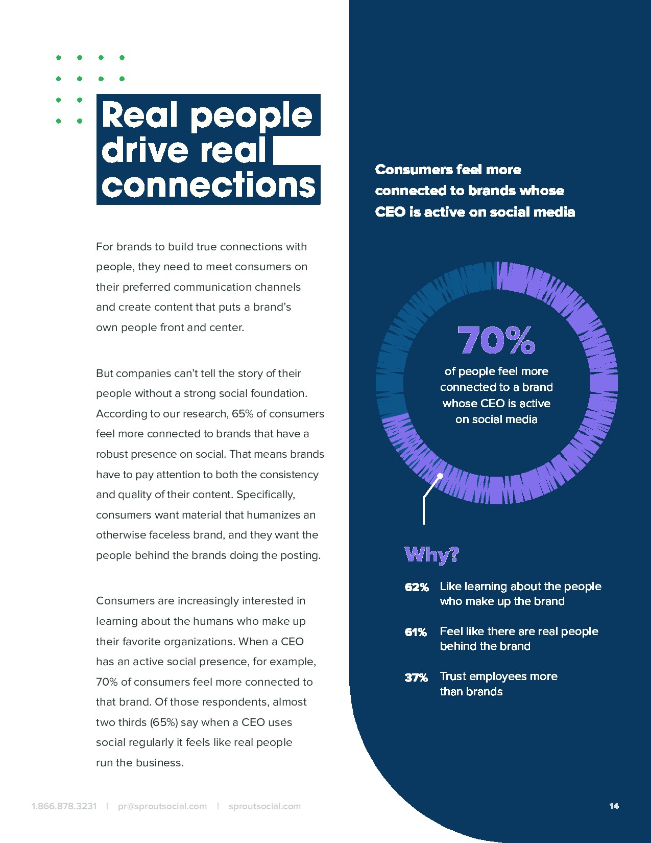 真正的人是建立真实联系的关键。消费者希望更多地了解他们喜爱的品牌背后的人。例如,70%的消费者表示,当一个品牌的首席执行官积极参与社交活动时,他们感觉与品牌的关系更加紧密。此外,72%的消费者表示,当员工在网上分享一个品牌的信息时,他们也有类似的感觉。