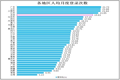 数据显示,网易邮箱用户人均月度登录次数为19.6次。用户在广东登录最频繁,人均月度登录次数为21.73次,其次为山东(21.68次)、上海(21.64次)、江苏(21.05次)、北京(17.19次)、浙江(17.04次)、天津(16.21次)。网易邮箱用户人均月度发信封数为11.3封。各地区月度发信量分布差异较大,东南沿海发达地区较为活跃。