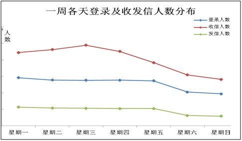 一周时间中,用户工作日与周末的登录人数差异较大,工作日明显多于周末。在5个工作日里,周一登录邮箱人数最多。工作日收信用户数多于周末,一般周三为收信高峰期。一天中,用户登录网易邮箱的人数分布可以分为3个周期,早上4-13点、13-20点、20点-次日4点。整天峰值为早上10点。