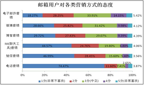 对于电子邮件营销方式,19.56%用户表示喜欢(即打分为4-5分),另外33.91%的用户持中立态度(即打分为3分)。几种营销方式对比来看,电子邮箱营销被最多邮箱用户选择喜欢而最少用户选择不喜欢,可见电子邮箱营销是用户接受程度最高的营销方式。微博营销和博客营销分别排二、三位。
