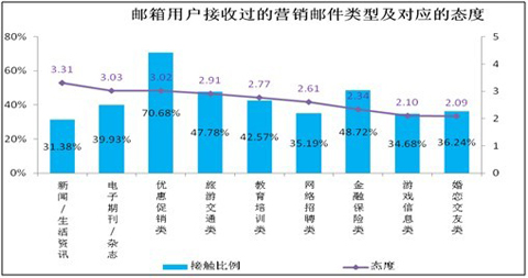 邮箱用户接收过的营销邮件类型中,70.68%用户接收过优惠促销类邮件,遥遥领先于其他类型营销邮件。邮箱用户对各类营销邮件的态度,得分最高的为新闻/生活资讯类的邮件,均值为3.31分,电子期刊/杂志的态度均值为3.03分,优惠促销类为3.02分,此三种类型邮件的态度均值都超过3分,表明总体上用户对这些类型的邮件处于中立偏喜欢的态度。