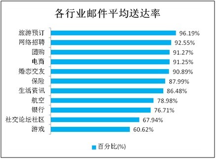 各行业发送的邮件中,旅游预订行业的平均送达率高达96.19 %;其次是网络招聘,平均送达率为92.55%;社交论坛类及游戏类表现不佳,平均送达率都不超过70%。