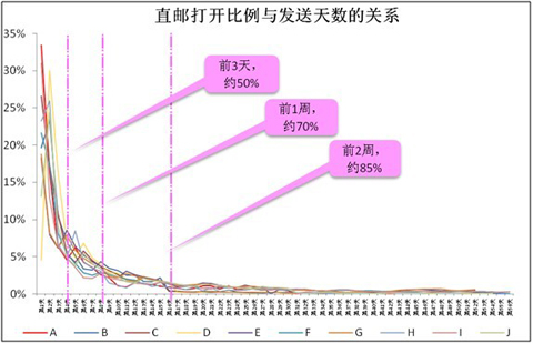 数据显示,直邮打开高峰当天即发送当天一般打开比例约25%。前三天打开比例有一半左右,因此前三天为关键时间。直邮发送后一周内可以达到7成的比例,而两周基本占了全部打开量的85%。