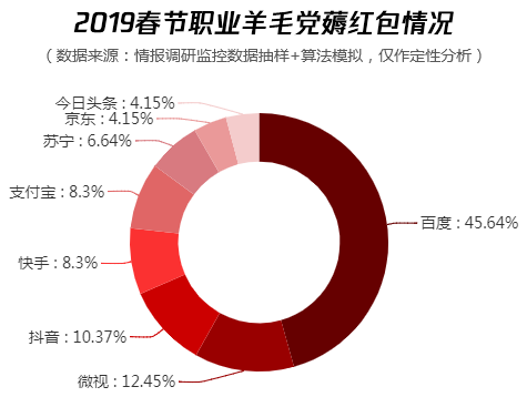 各大互联网公司疯狂砸钱,羊毛党也在敲骨吸髓,疯狂扫荡。据情报分析调查,在各大平台重磅推出的春节红包活动中,百度红包由于金额较大,且自动化薅取成本低,成为职业羊毛党最爱刷取的目标。
