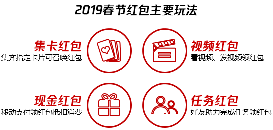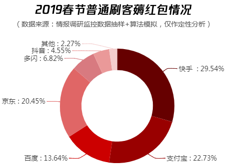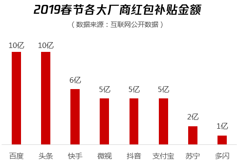 今年红包大战的入局者,在一定程度上反映了现阶段各厂商在移动互联网领域的竞争野心与动向。其中,百度在今年重金入局,一举斩获春晚合作权,豪掷10亿红包。头条同样狂撒10亿,与百度并肩成为今年春节红包大战的最壕氪金玩家。值得注意的是,快手、微视、抖音等短视频业务则牢牢占据第二梯队,各自砸出5~6亿的资金。可见,进入2019年,短视频仍是各大巨头不遗余力争相抢夺的流量高地。