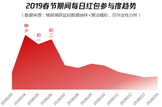 据腾讯防水墙分析,在长达半个多月的红包盛筵中,除夕到大年初二这3天,全民抢红包进入白热化阶段。其中,除夕(2月4日)作为节日气氛最浓厚、厂商红包活动最频繁、派发金额最多的一天,成为全民抢红包的流量最高峰。大年初二(2月6日)之后,红包舆论声量明显减弱,关注度和参与度开始降低。