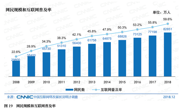 截至2018年12月,我国网民规模为8.29亿,全年新增网民5653万,互联网普及率达59.6%,较2017年底提升3.8个百分点。