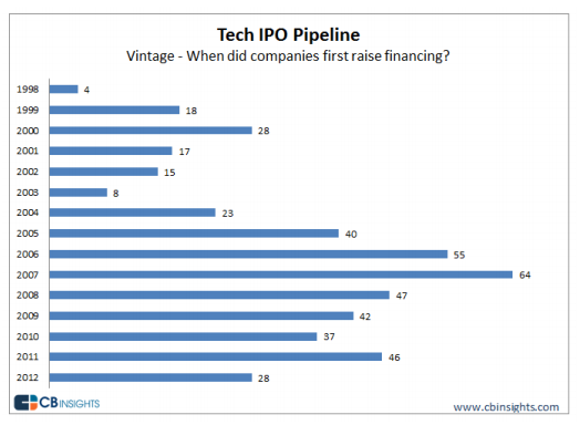 图1. 不同年份拿到第一笔投资的公司数量(1998年-2012年)
