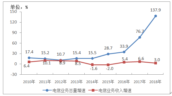 ②2010-2015年电信业务总量按照2010年不变单价计算,2016-2018年按照2015年不变单价计算。