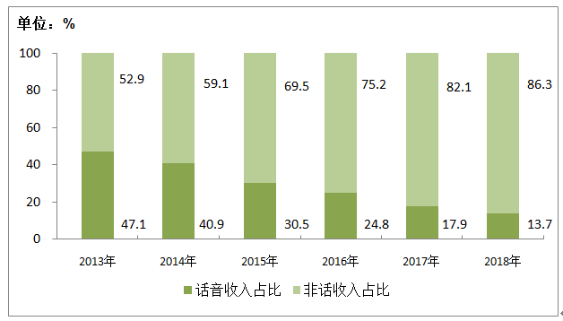 图1-3 2013-2018年电信收入结构(话音和非话音)情况
