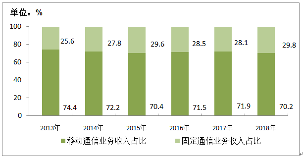 图1-2 2013-2018年移动通信业务和固定通信业务收入占比情况