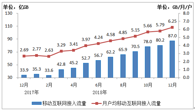 2018年,各种线上线下服务加快融合,移动互联网业务创新拓展,带动移动支付、移动出行、移动视频直播、餐饮外卖等应用加快普及,刺激移动互联网接入流量消费保持高速增长。2018年,移动互联网接入流量消费达711亿GB③,比上年增长189.1%,增速较上年提高26.9个百分点。全年移动互联网接入月户均流量(DOU)达4.42GB/月/户,是上年的2.6倍;12月当月DOU高达6.25GB/月/户。其中,手机上网流量达到702亿GB,比上年增长198.7%,在总流量中占98.7%。