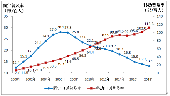图2-1 2000-2018年固定电话及移动电话普及率发展情况