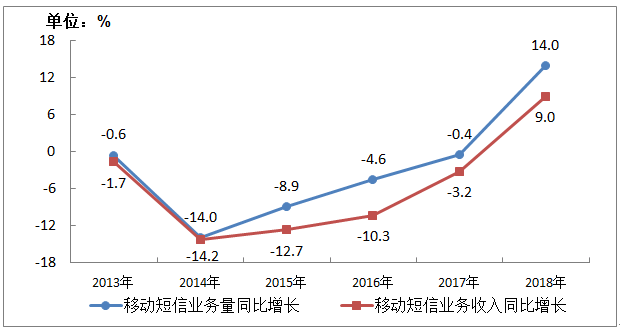 图3-3 2013-2018年移动短信业务量和收入增长情况