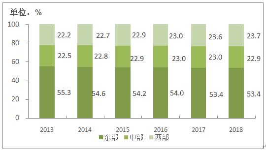 图5-1 2013-2018年东、中、西部地区电信业务收入比重