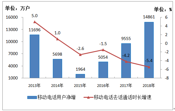 图3-4 2013-2018年移动电话用户和通话量增长情况