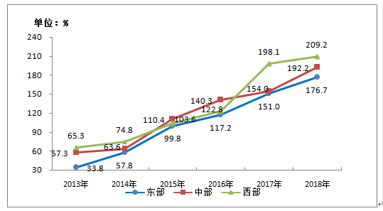 图5-3 2013-2018年东、中、西部移动互联网接入流量增速情况