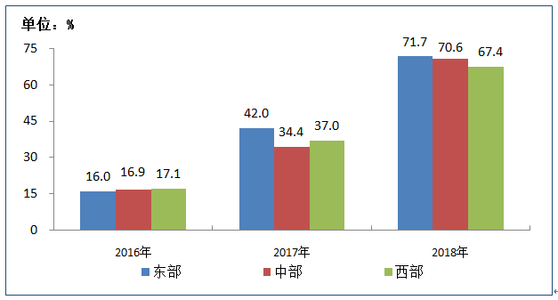 图5-2 2016-2018年东、中、西部地区100Mbps及以上固定宽带接入用户渗透率情况