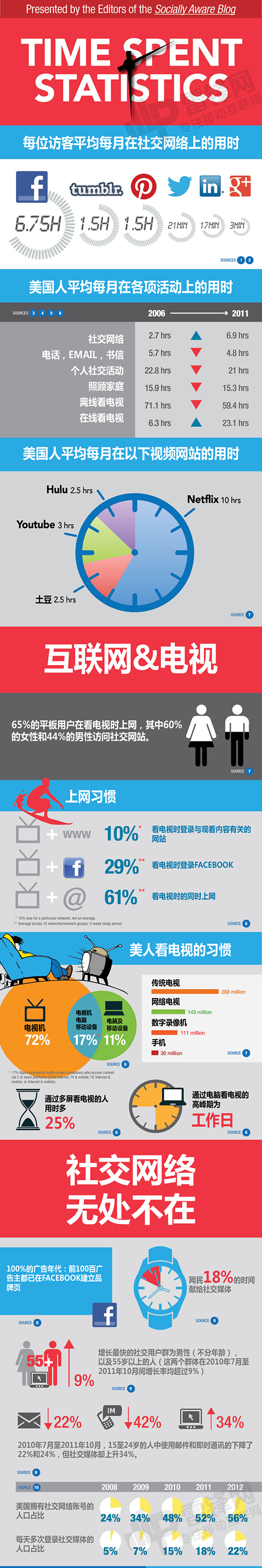 在众多的社交媒体网站之间,Facebook依然是勿庸置疑的王者。Facebook用户平均每个月花了近7个小时在网站上游荡, Tumblr和Pinterest用户的这一数据为1.5小时,两家网站并列第二位。Twitter, LinkedIn和Google+用户的数据均不到半个小时。