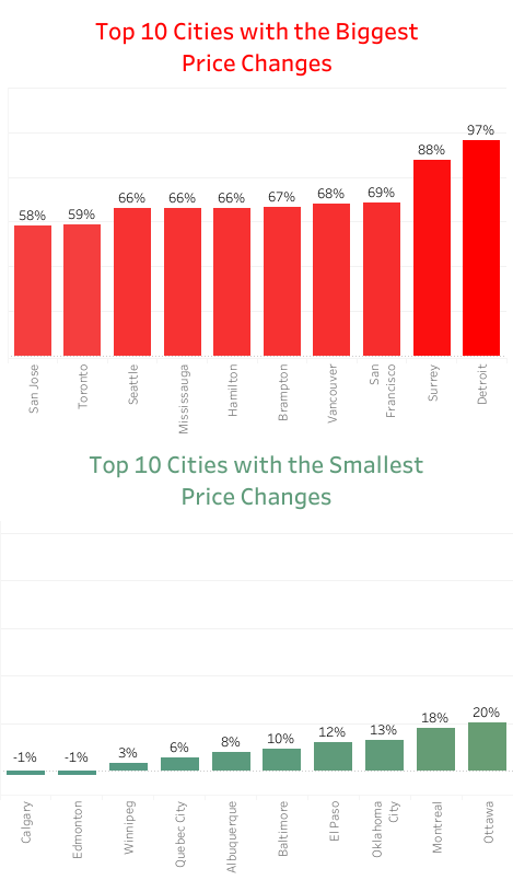 与5年前相比,只有两个城市的房价出现了下降,而且这两个城市都位于加利福尼亚州的阿尔伯塔:卡尔加里和埃德蒙顿。