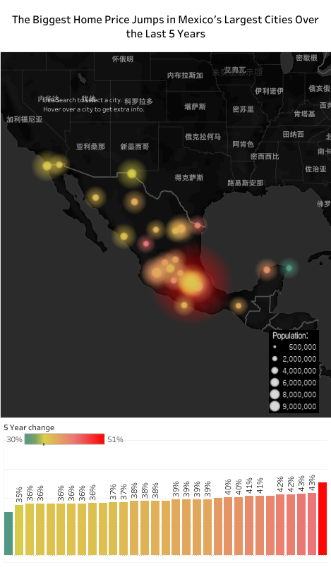 在北美83个最大的房地产市场中有18个的房价在短短5年内上涨了50%以上。在18个最具爆炸性增长的市场中有11个在美国,6个在加拿大,1个在墨西哥。