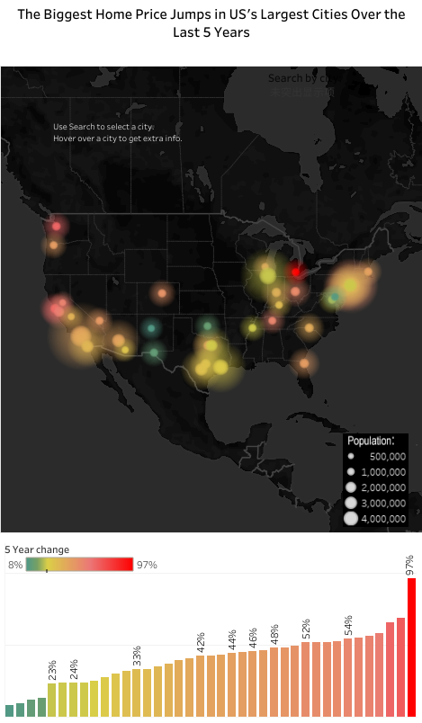 为了了解过去5年来北美哪些城市的房价变化最为显著,Point2Homes考察了人口超过50万的大城市,并根据房价的变化对其进行了排名。