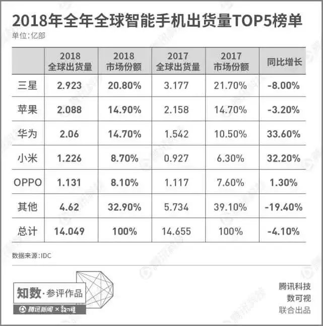更让苹果的难受的是,走出中国的智能手机厂商,不仅在中国市场给苹果带来麻烦,也在全球狙击苹果iPhone。根据IDC的数据,2018年全球智能手机出货量同比下降4.1%,其中苹果下降3.2%,而华为,小米这两家来自中国的企业却同比增长30%多。