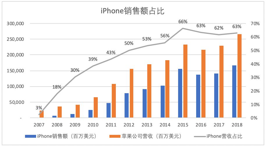 作为史上最畅销的手机品牌,iPhone也过去成为驱动苹果营收增长的重要硬件设备。不计算iPhone带来的服务业务营收,仅凭iPhone硬件销售收入占比就超过60%。iPhone的流行也带动了苹果其他硬件产品的销售,如iPad,Mac,可穿戴设备等。