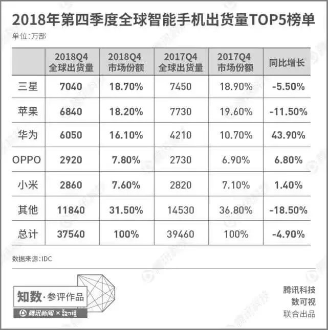 最近则更加恶化,当我们把眼光放在2018年4季度的全球智能手机出货量排名时,可以看到在整个市场下滑4.9%的情况下,苹果出货量下滑速度高达11.5%。