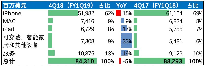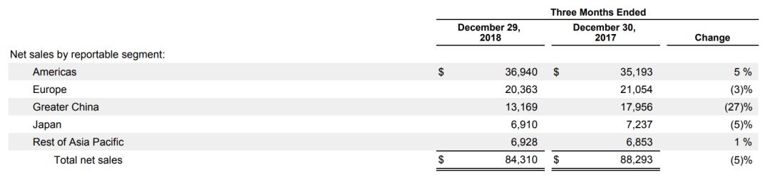 尽管早已有先兆,但这个拐点在苹果最新一个财季的财报(F19Q1)披露出来时,还是颇为让人震惊。根据苹果发布截止到2018年底的季度业绩,苹果F1Q19季度营收为843亿美元,同比减少5%,其大中华区更是下降高达27%。