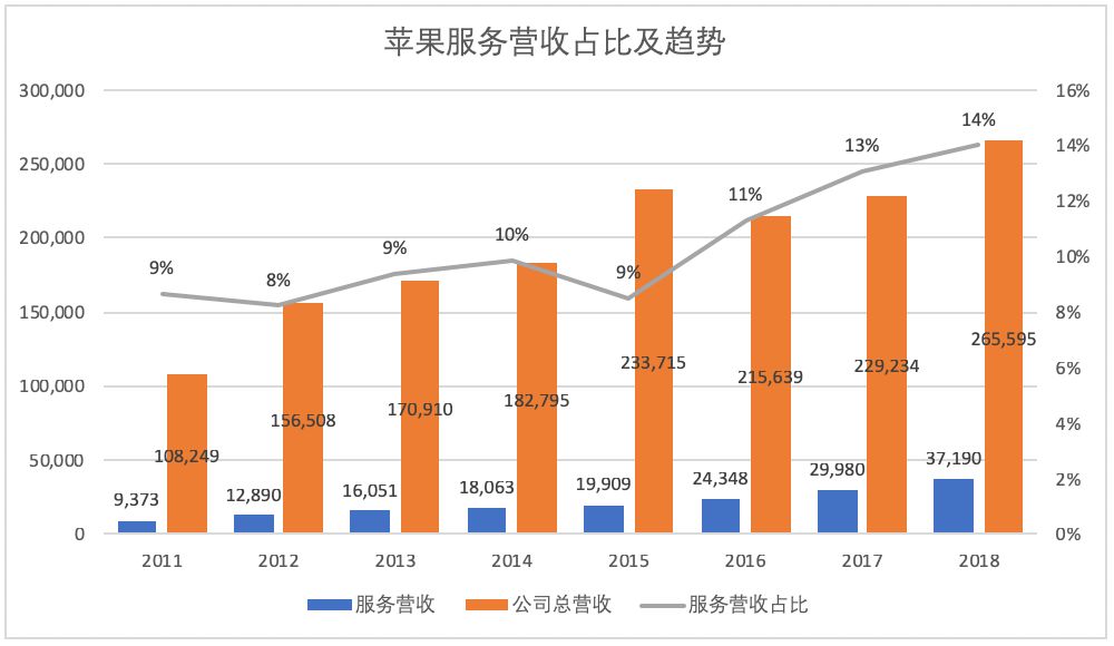 苹果的“服务类”业务包括iTunes, ios和Mac版的应用商店, 苹果音乐, iCloud云服务, Apple Pay, and AppleCare额外保修业务。如下图所示,苹果的服务营收业务在营收中的占比这几年提升到了14%,2018年服务营收达到了371.9亿美元。