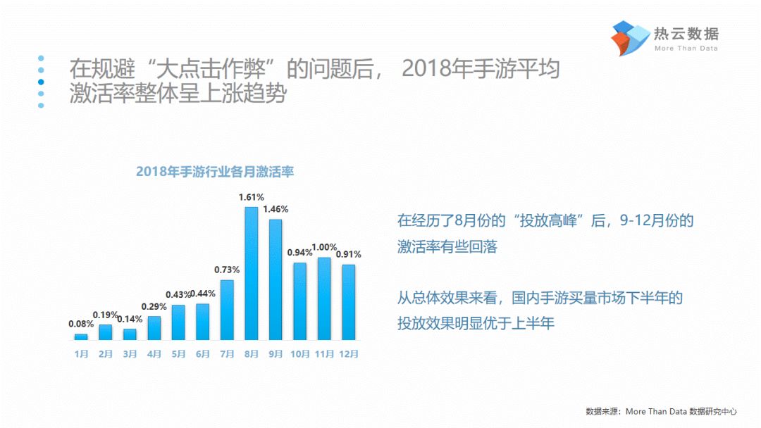 2018年手游买量行为相对谨慎,8月和12月是年内的两次投放高峰;