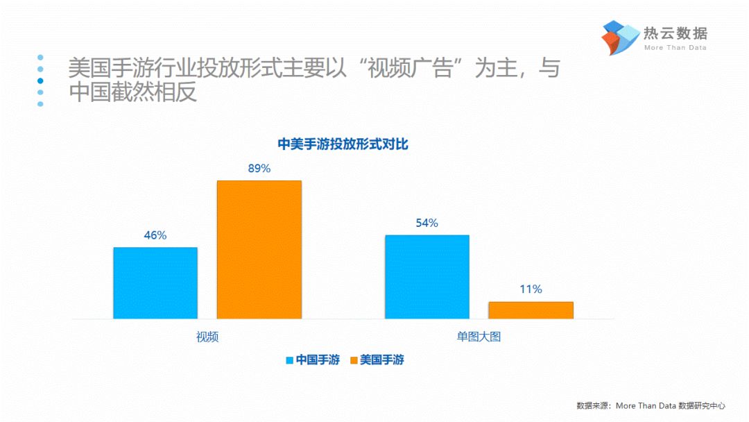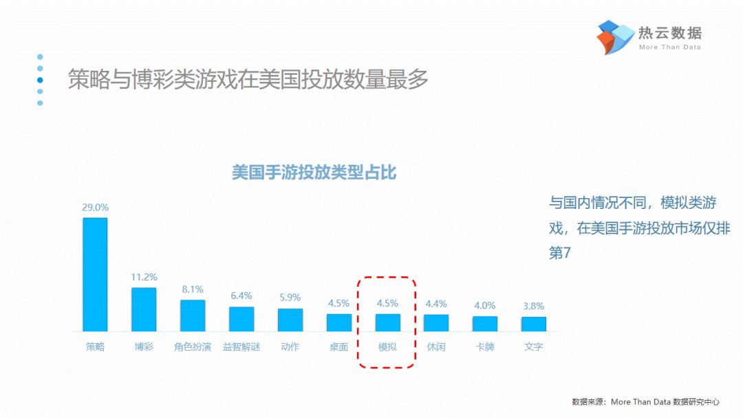 美国手游买量的特征与国内情况存在差异。美国投放手游数量最多的类型是策略类与博彩类且投放形式主要以“视频广告”为主。